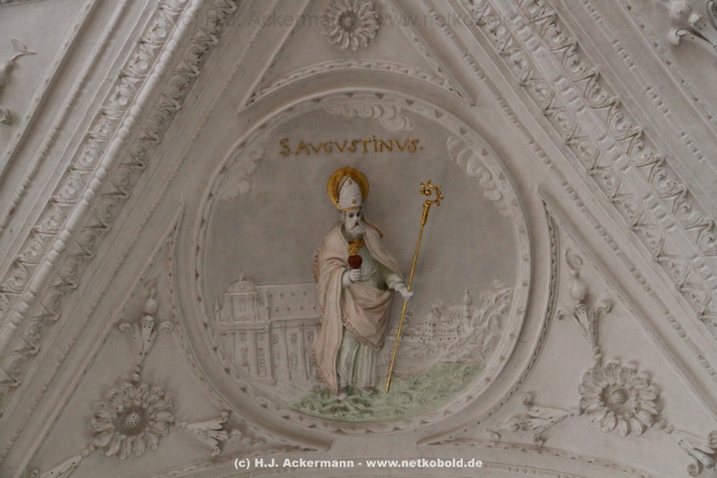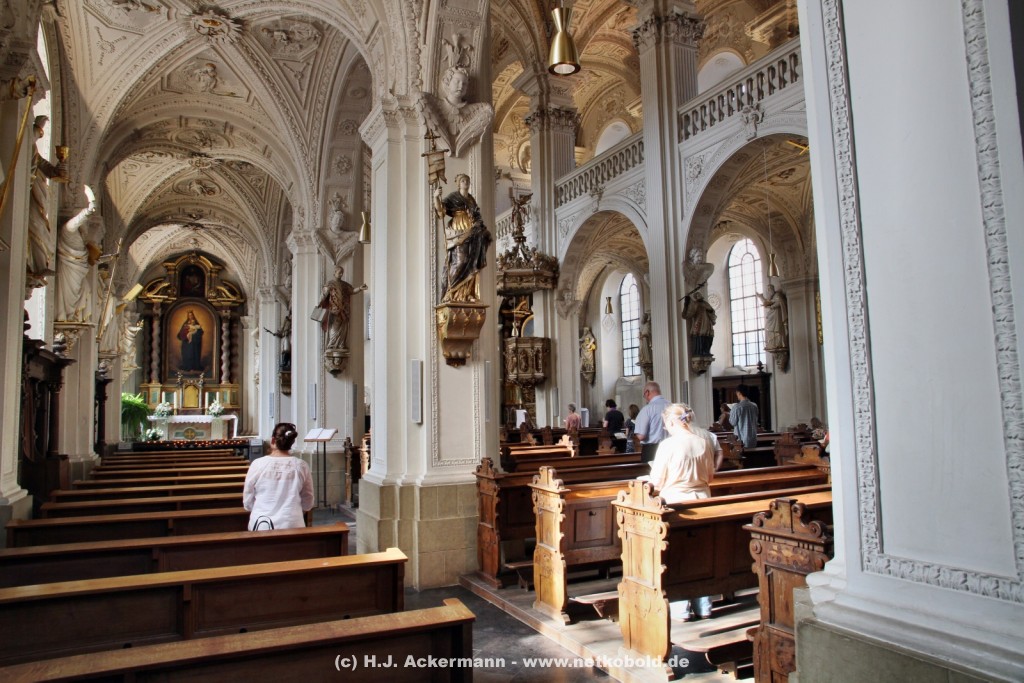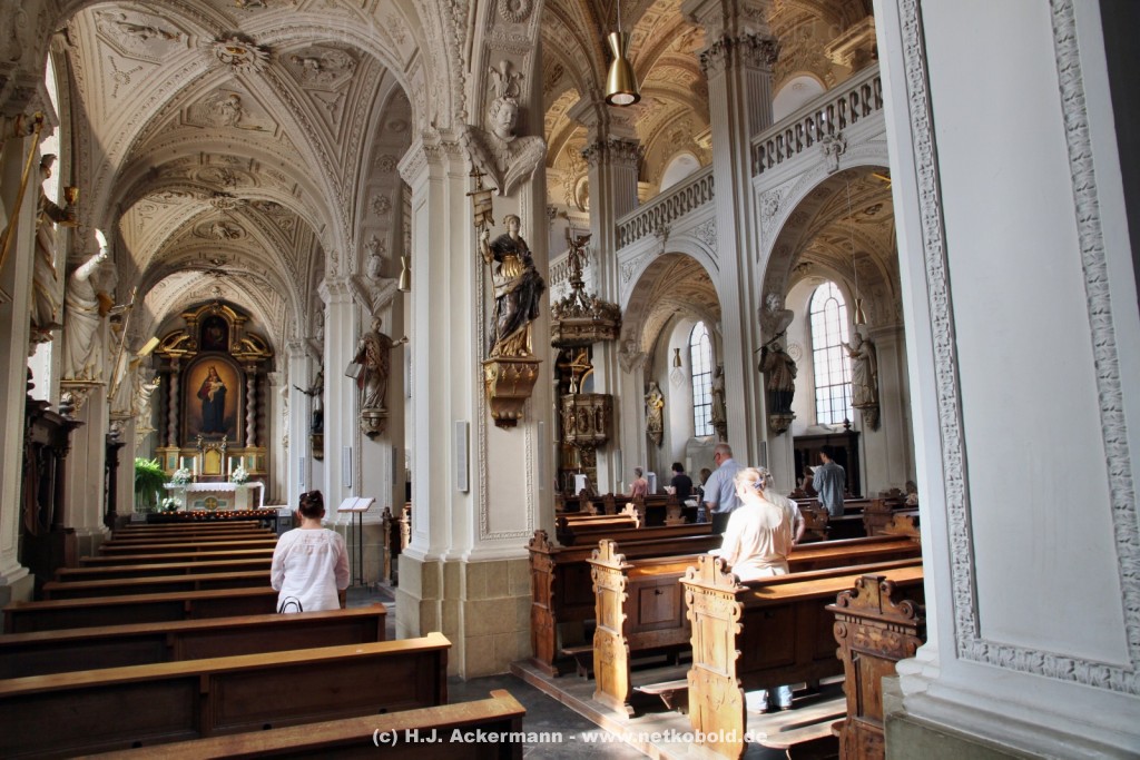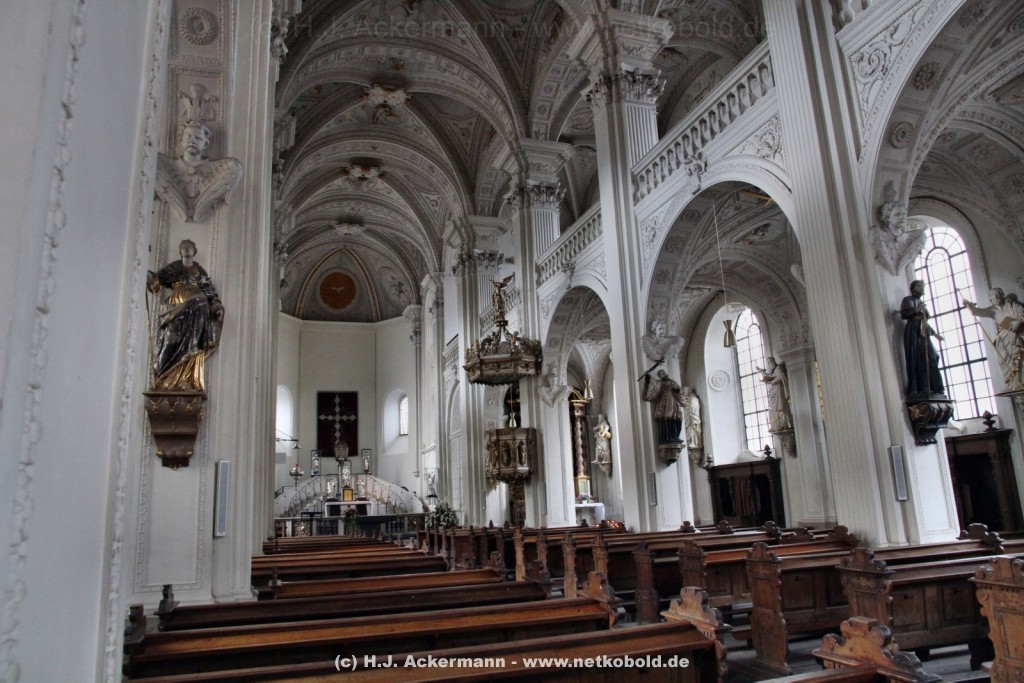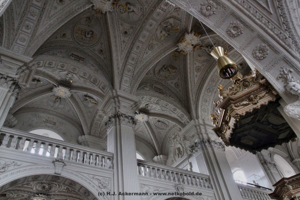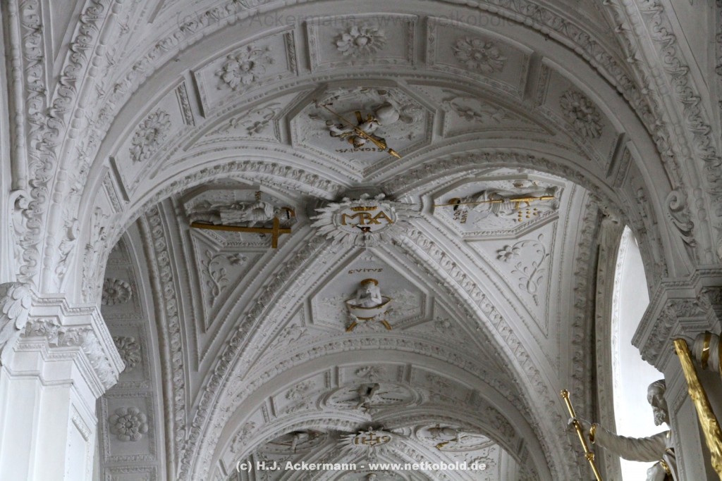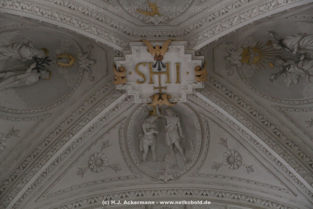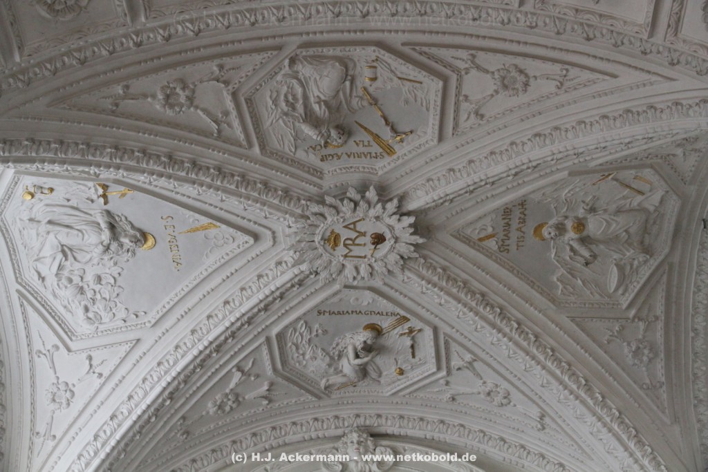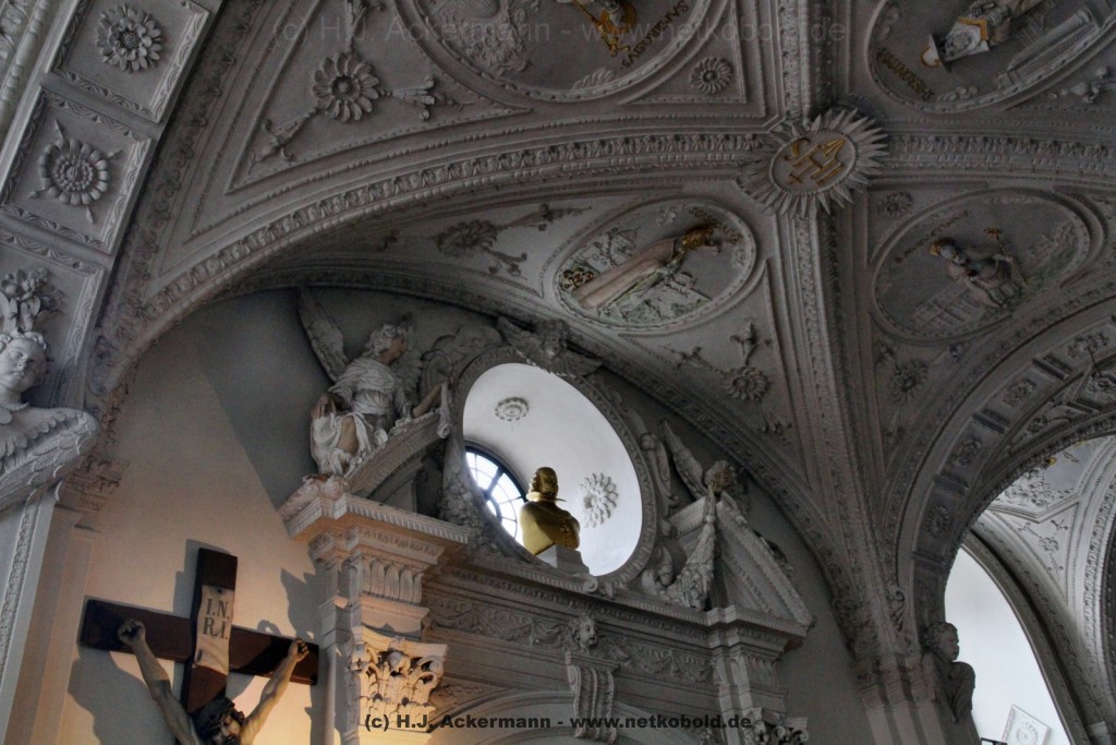 Die Kirche wurde während des Dreißigjährigen Krieges von 1622-1629 gebaut. Beim Betreten der prunkvollen Kirche fallen unter anderem sofort Stuckarbeiten an der Decke auf.