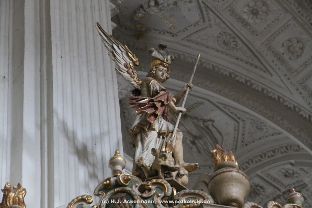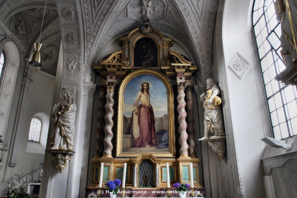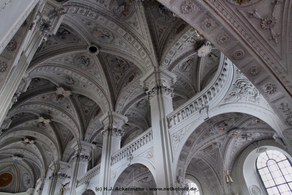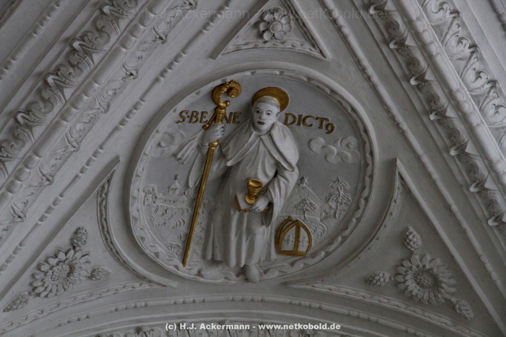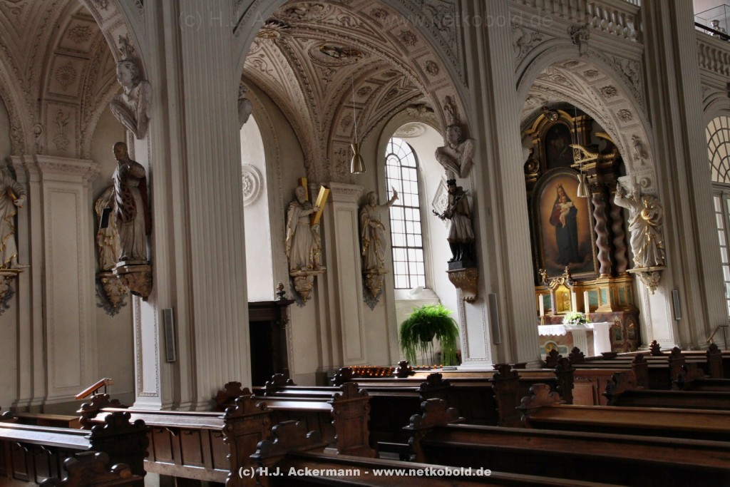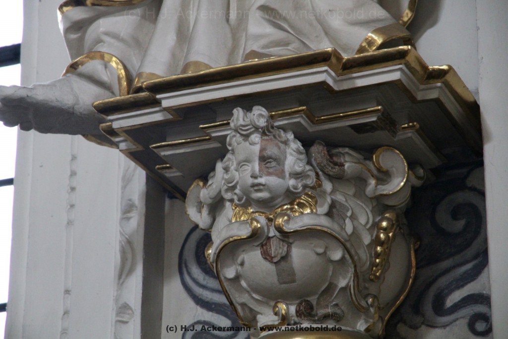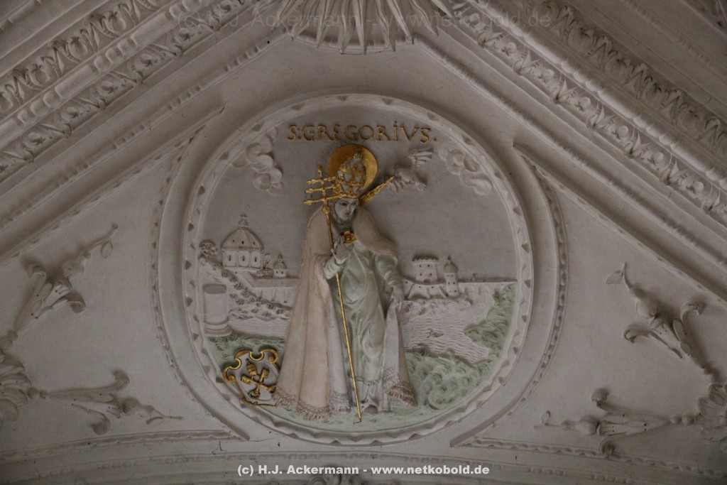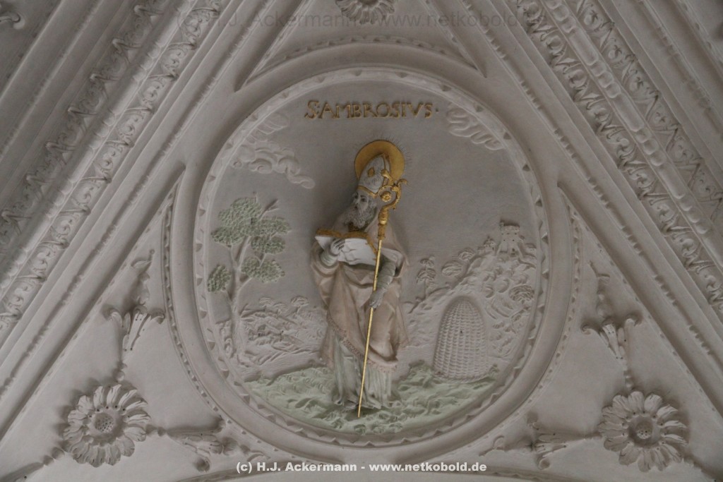 Die Kirche wurde während des Dreißigjährigen Krieges von 1622-1629 gebaut. Beim Betreten der prunkvollen Kirche fallen unter anderem sofort Stuckarbeiten an der Decke auf.