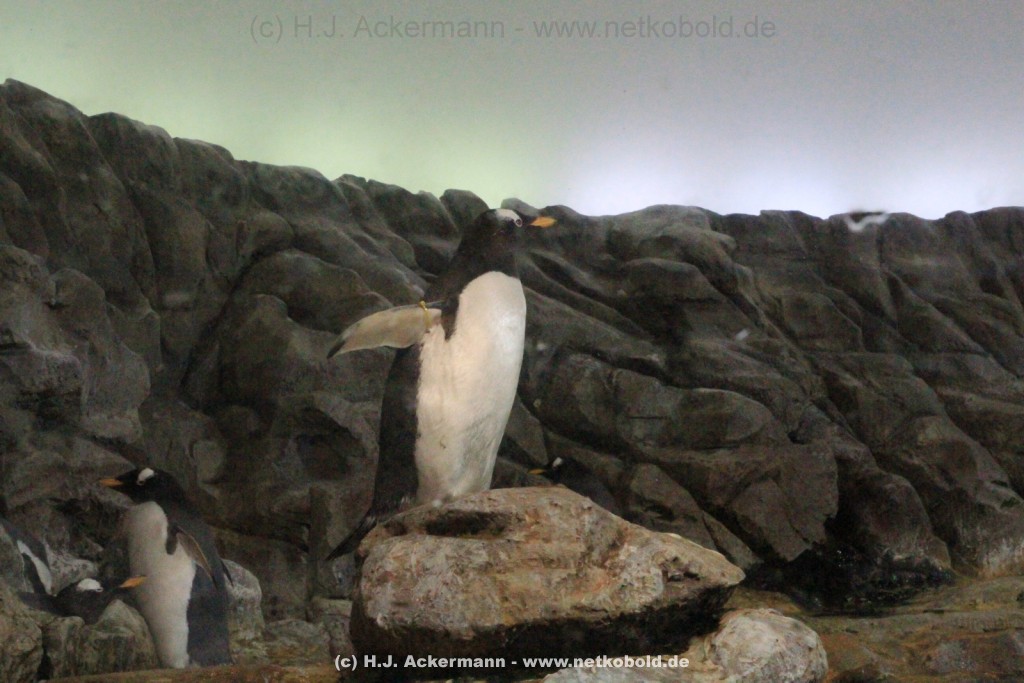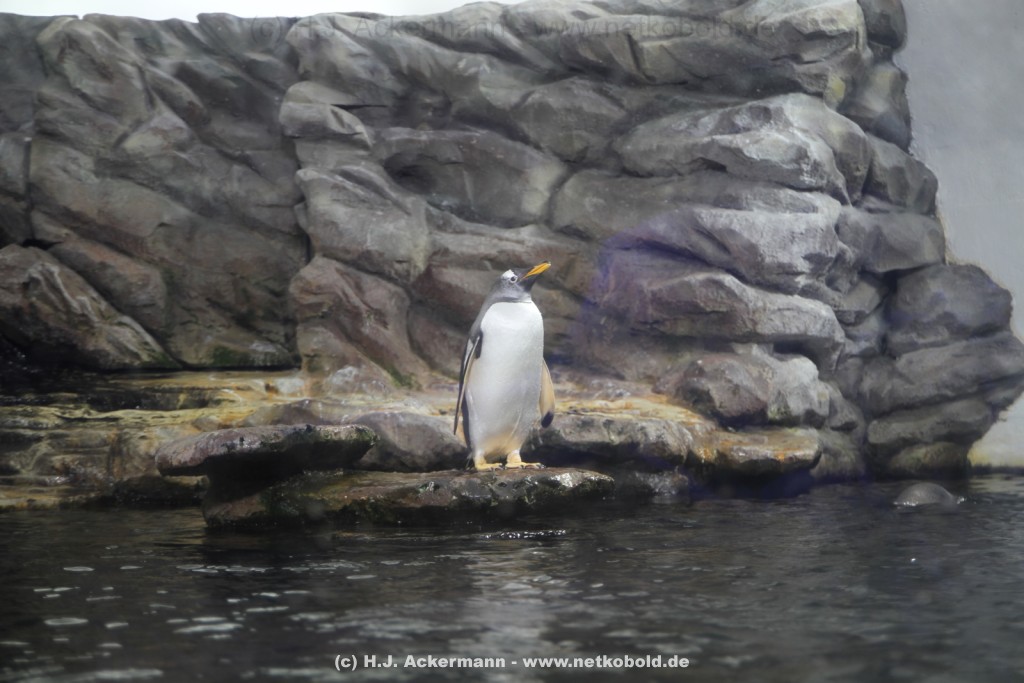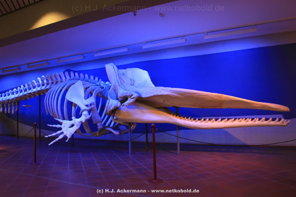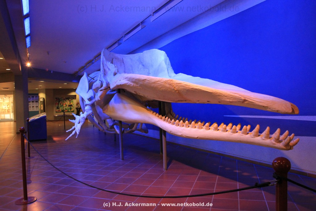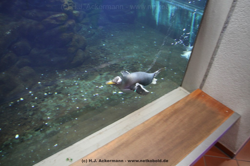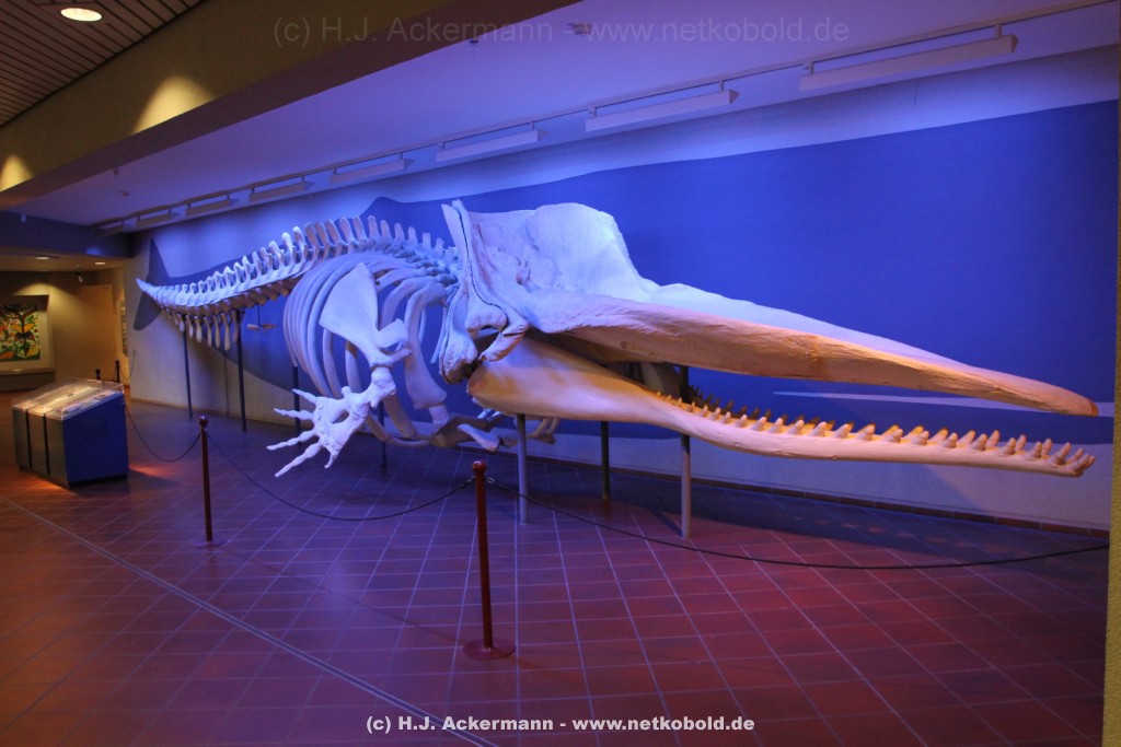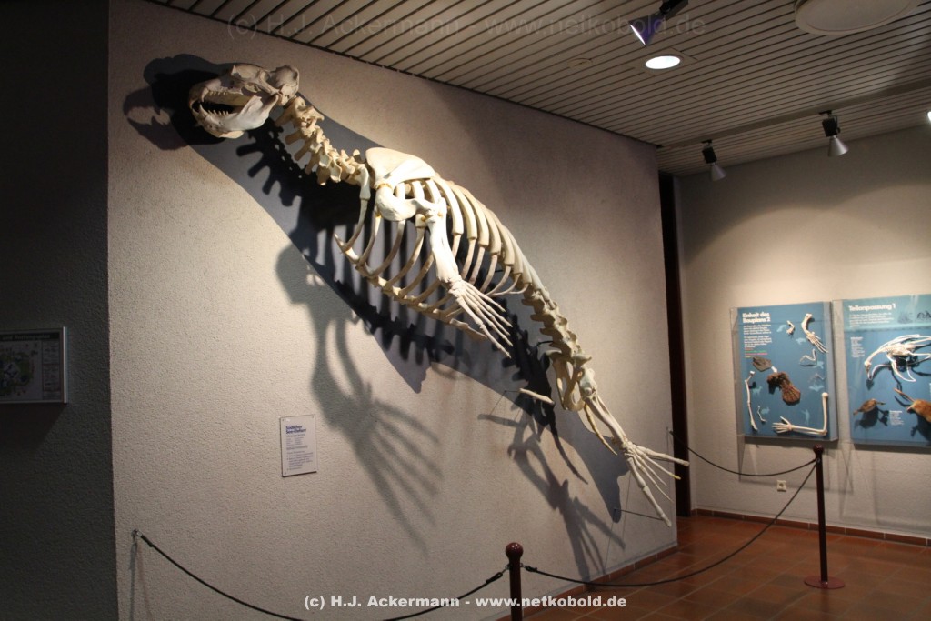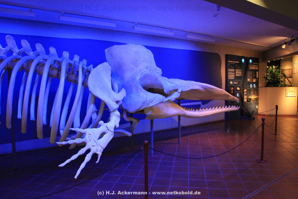 Imposant ist das 17 m lange Pottwalskelett, auf das der Blick sofort fällt, nachdem man den Eingangsbereich passiert hat. Vitrinen und Modelle im Raum informieren über die Anpassung höherer Wirbeltiere an das Leben im Wasser. Lebende Vertreter dieser Anpassungsfähigkeit sind die Eselpinguine, die seit 1987 im Aquazoo in einem sog. „Indoor“- Gehege gehalten werden. Damit sich die Pinguine wohlfühlen und auch brüten können, wird ihre Ersatzheimat auf +10°C gekühlt.
