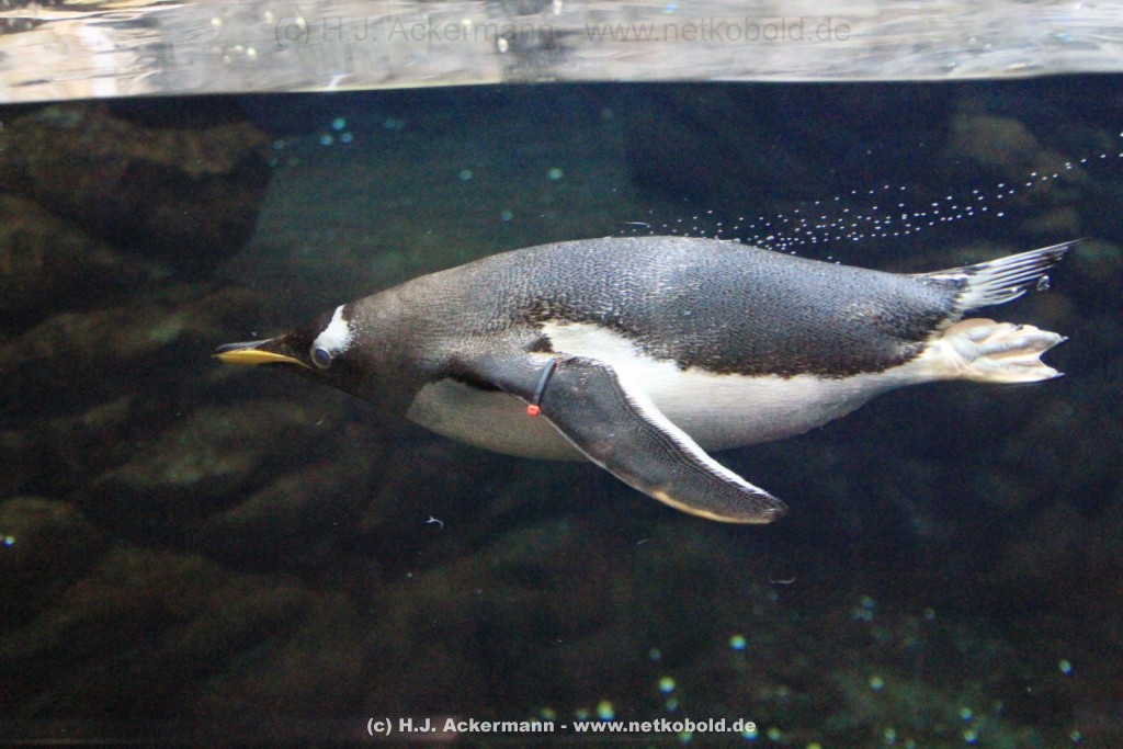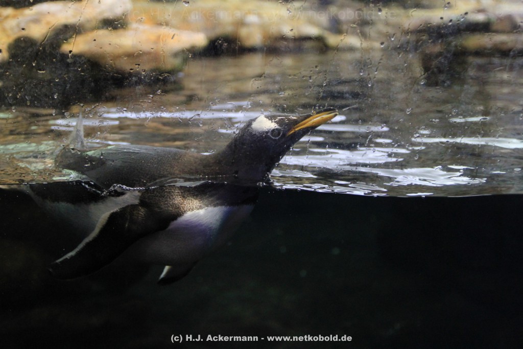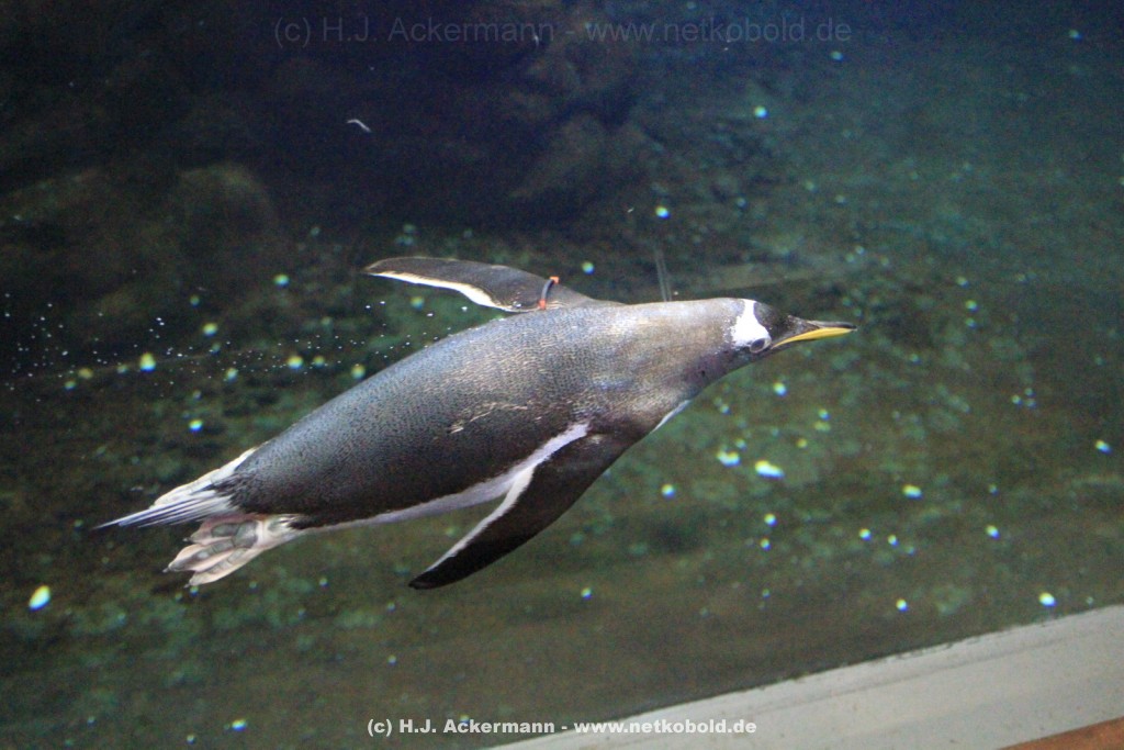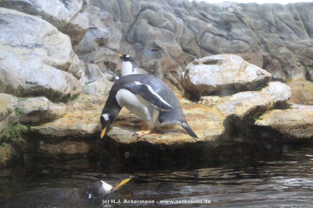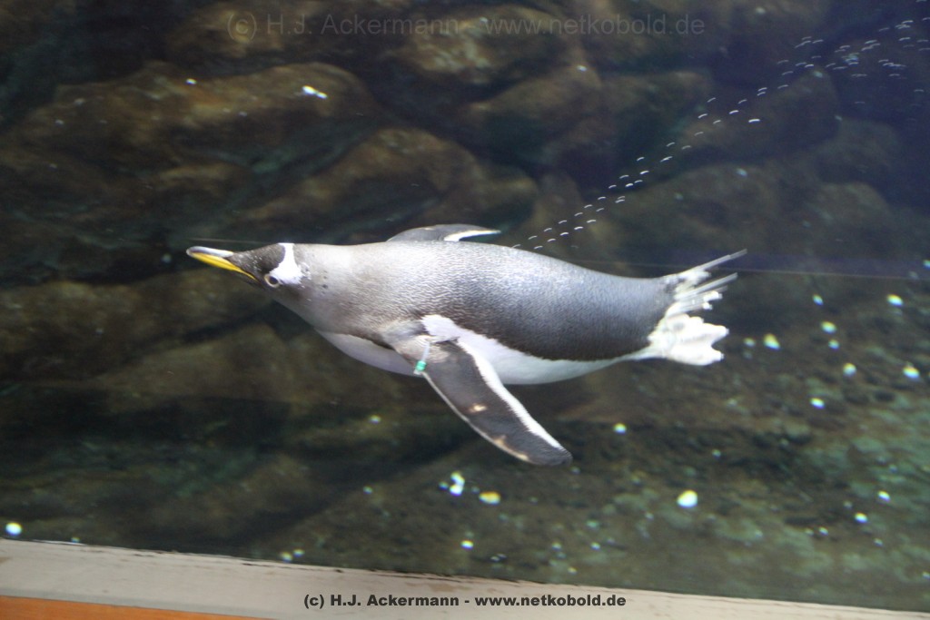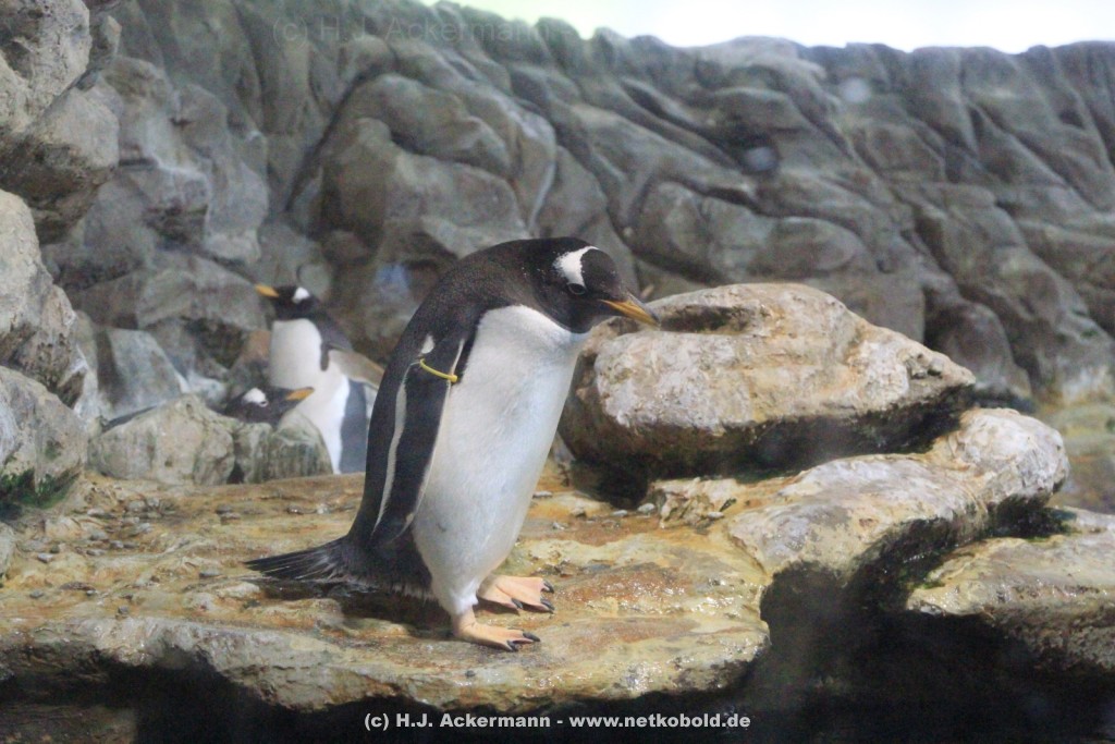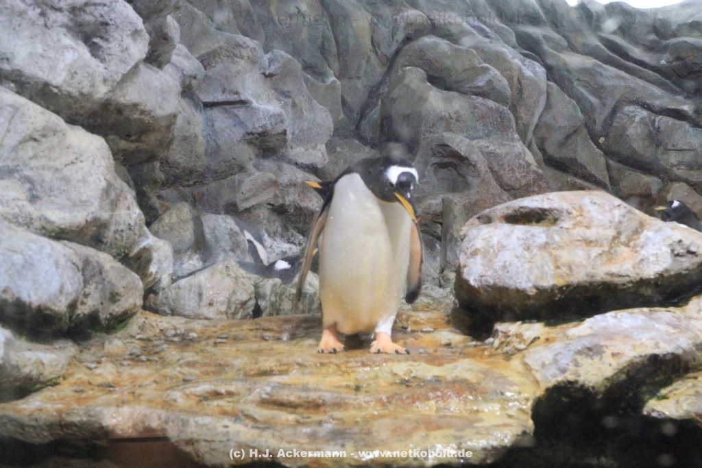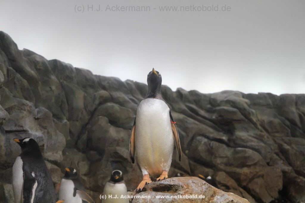 Imposant ist das 17 m lange Pottwalskelett, auf das der Blick sofort fällt, nachdem man den Eingangsbereich passiert hat. Vitrinen und Modelle im Raum informieren über die Anpassung höherer Wirbeltiere an das Leben im Wasser. Lebende Vertreter dieser Anpassungsfähigkeit sind die Eselpinguine, die seit 1987 im Aquazoo in einem sog. „Indoor“- Gehege gehalten werden. Damit sich die Pinguine wohlfühlen und auch brüten können, wird ihre Ersatzheimat auf +10°C gekühlt.