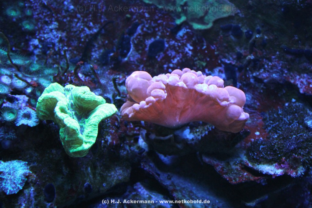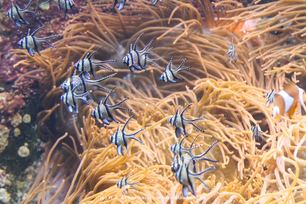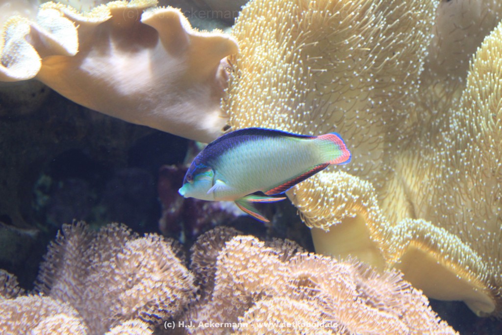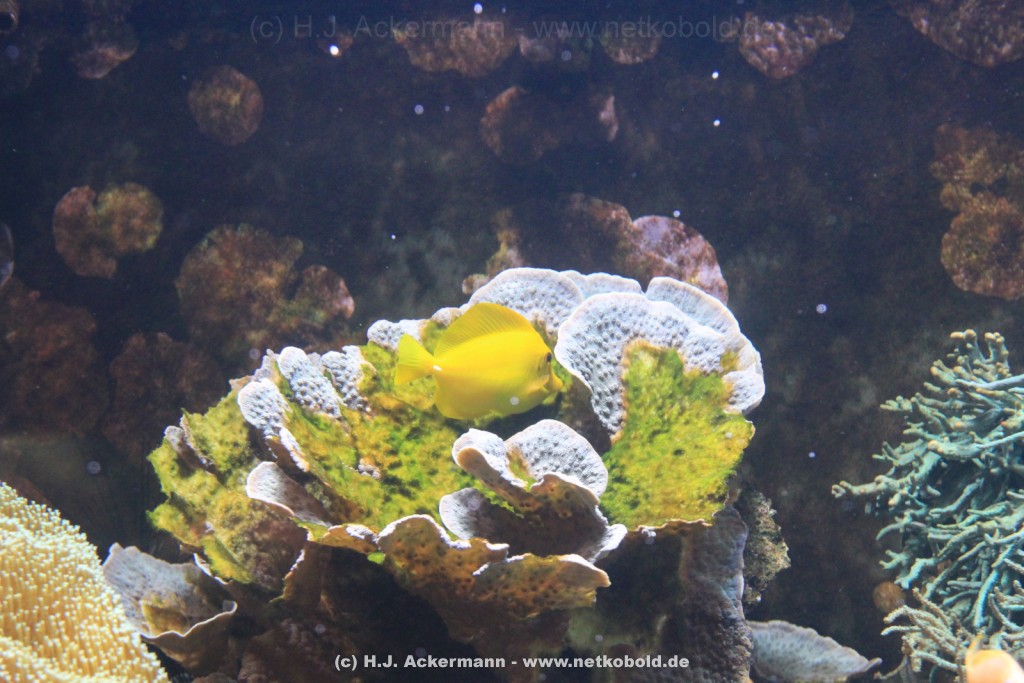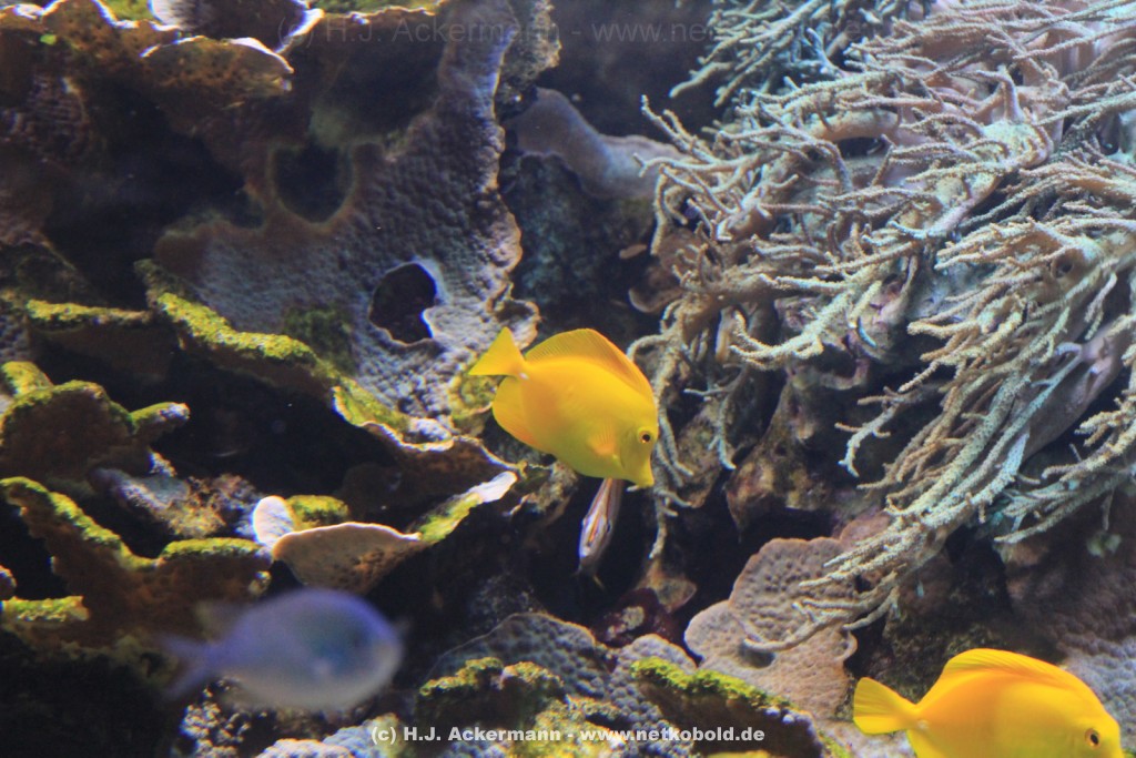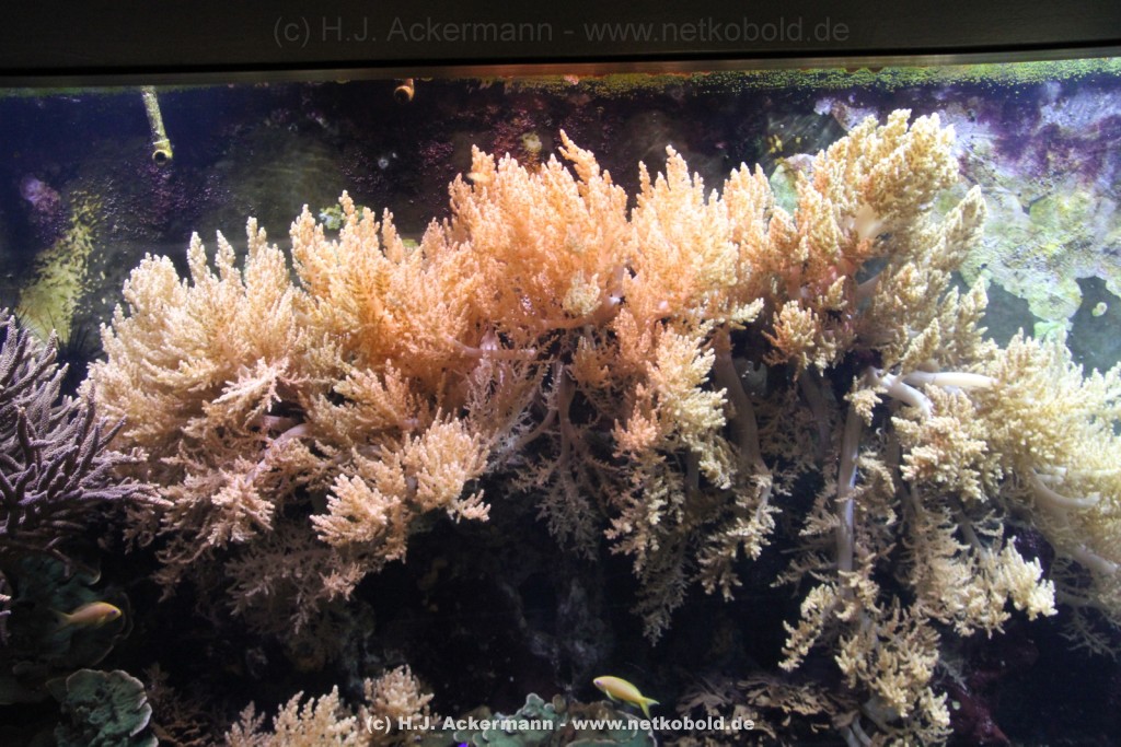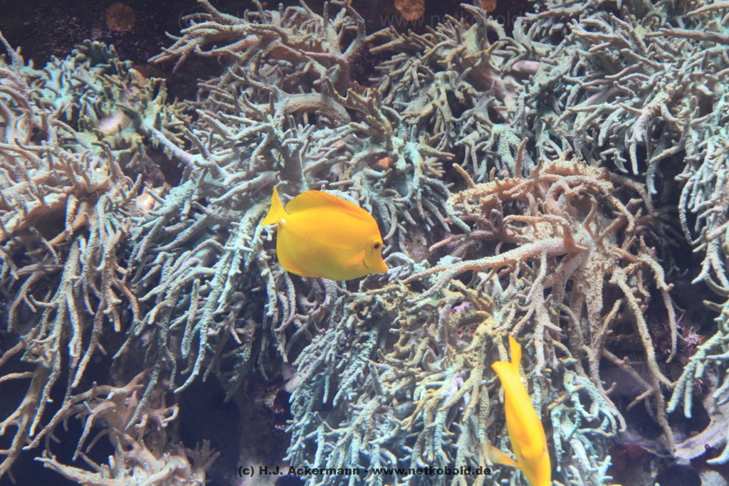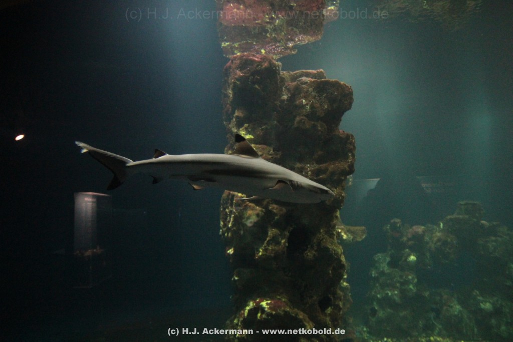 Im Themenraum Korallenriff gibt u.a. ein 17.500 l fassendes Meerwasserbecken mit seinen farbenfrohen Fischen, Korallen und Pflanzen Einblick in die faszinierende Unterwasserwelt dieses einzigartigen Lebensraumes. Weiß- und Schwarzspitzenriffhaie kann man hautnah im Haibecken gegenüber erleben.