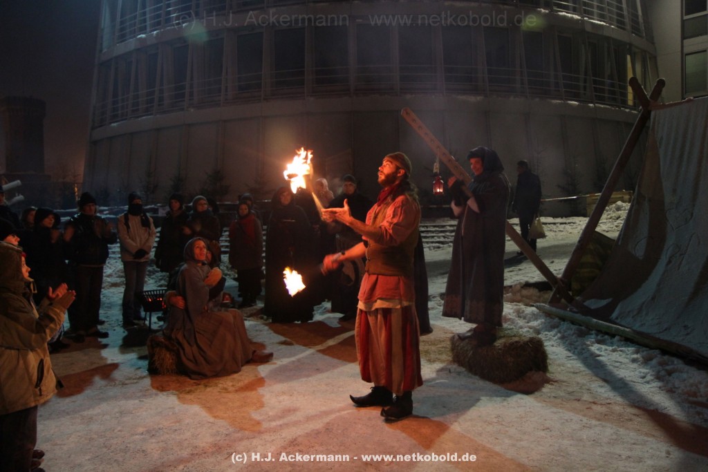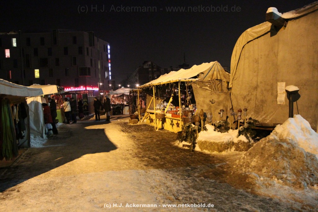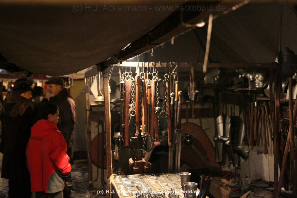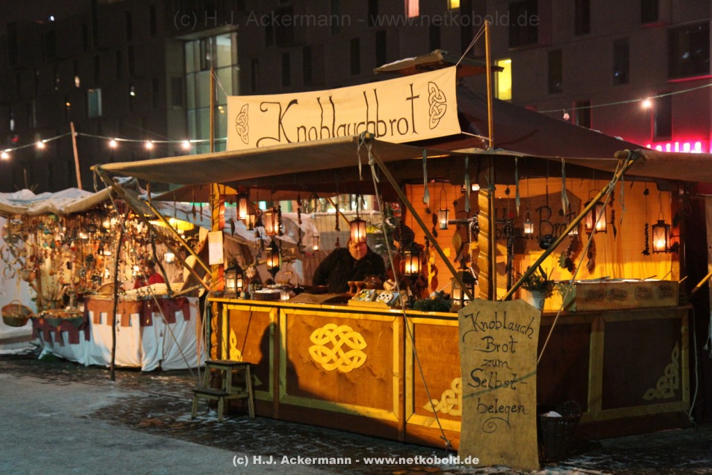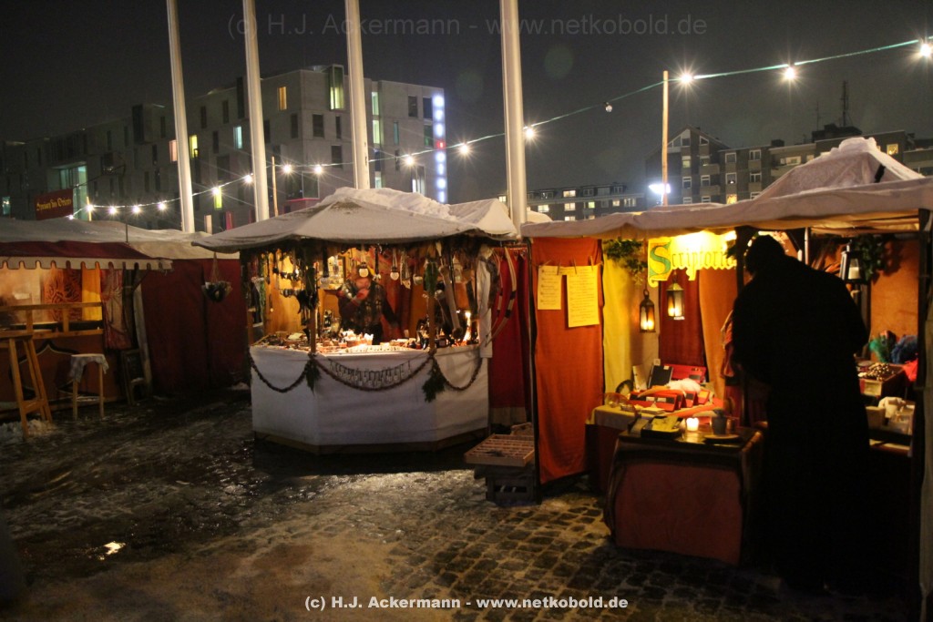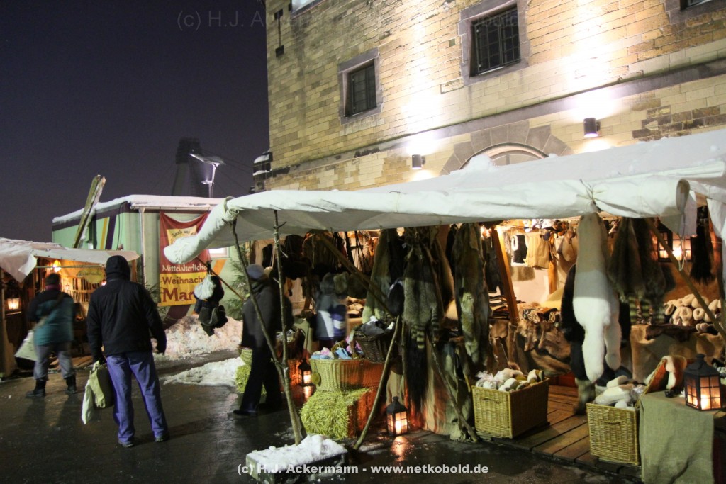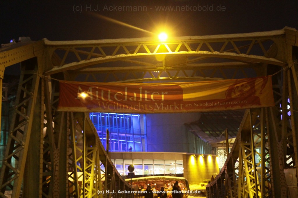 Der mittelalterliche Weihnachtsmarkt am Schokoladenmuseum in Köln fand zum elften Male statt. Viele Händler präsentieren hier ihre vor Ort handgefertigte Ware und mancher erzählt den Besuchern ,in mittelalterlicher Mundart, schöne Geschichten. Es duftet nach frisch gebackenem Brot. Für stimmungsvolle Atmosphäre sorgen Gaukler und Musikanten. Für die kleinen Besucher gibt es ein selbstgebautes Puppentheater und ein Mäuseroulette.