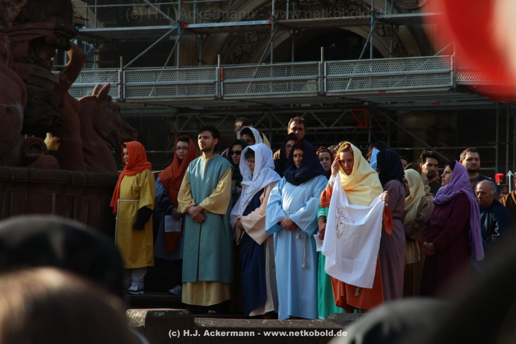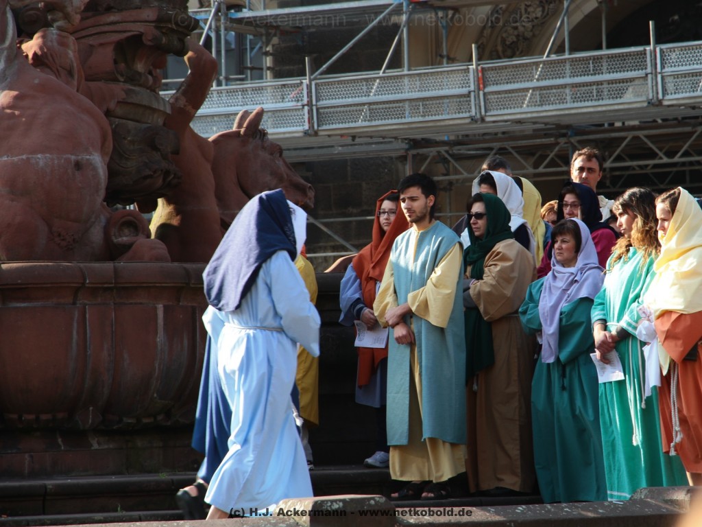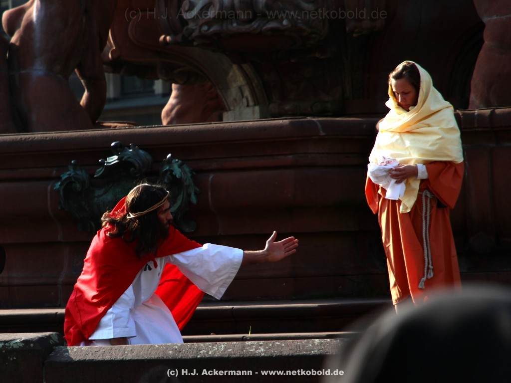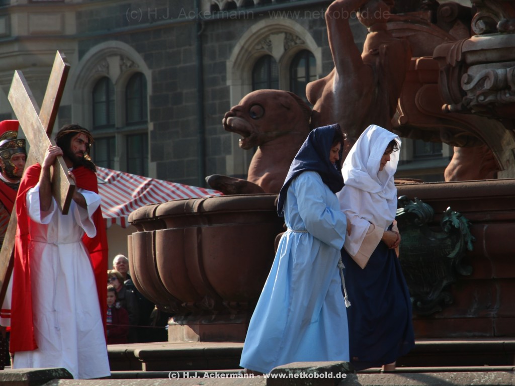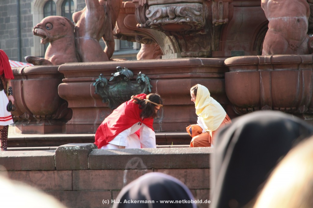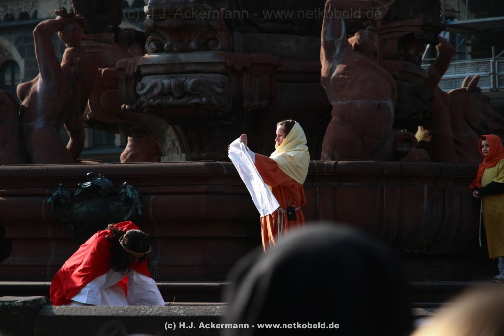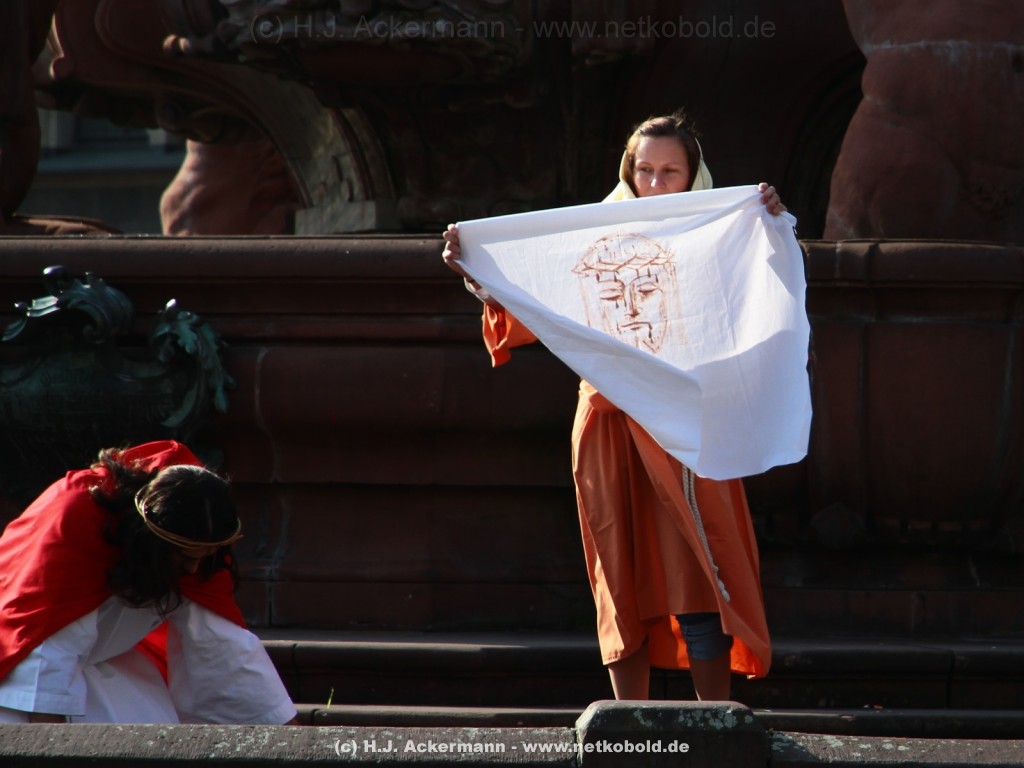 Am Neumarkt, direkt auf dem Brunnen spielt die nächste Scene. Hier trifft Jesus auf einige fromme Frauen. Darunter Veronika, die ihm ein Schweißtuch reicht und seine Mutter.
