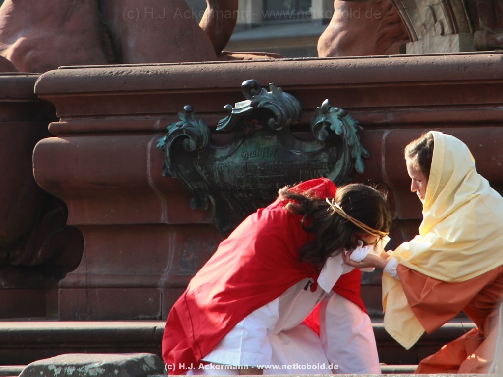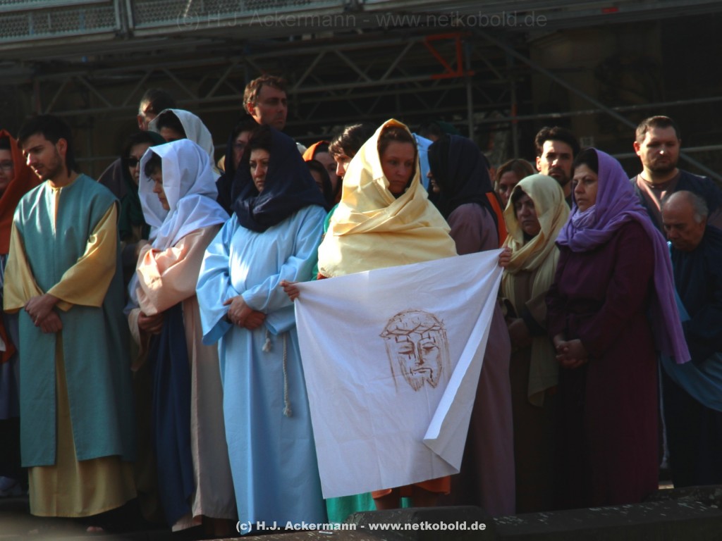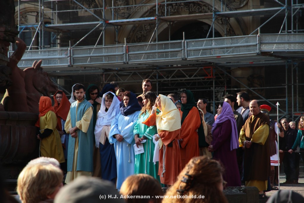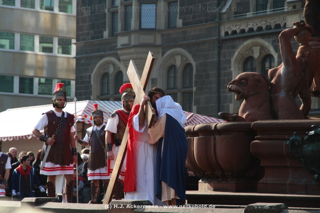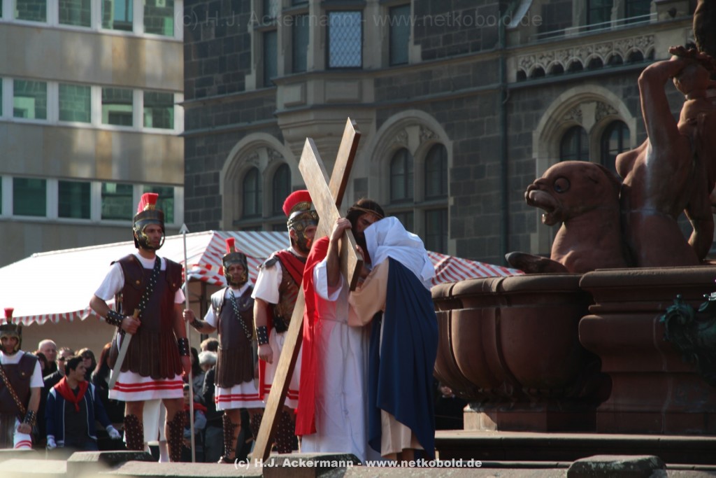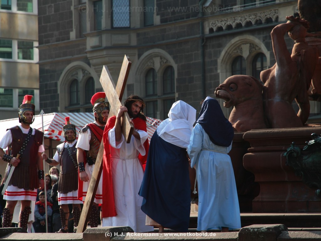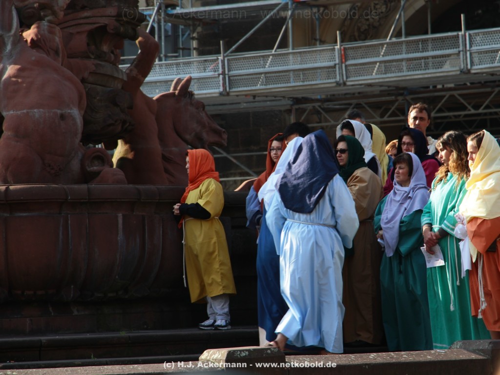Am Neumarkt, direkt auf dem Brunnen spielt die nächste Scene. Hier trifft Jesus auf einige fromme Frauen. Darunter Veronika, die ihm ein Schweißtuch reicht und seine Mutter.