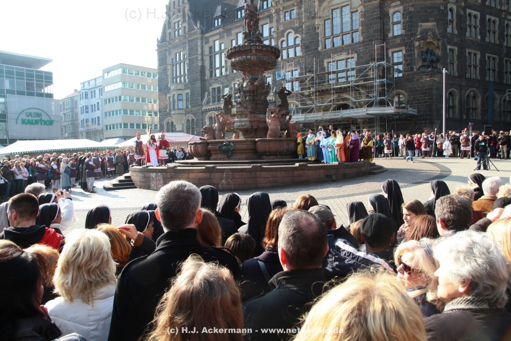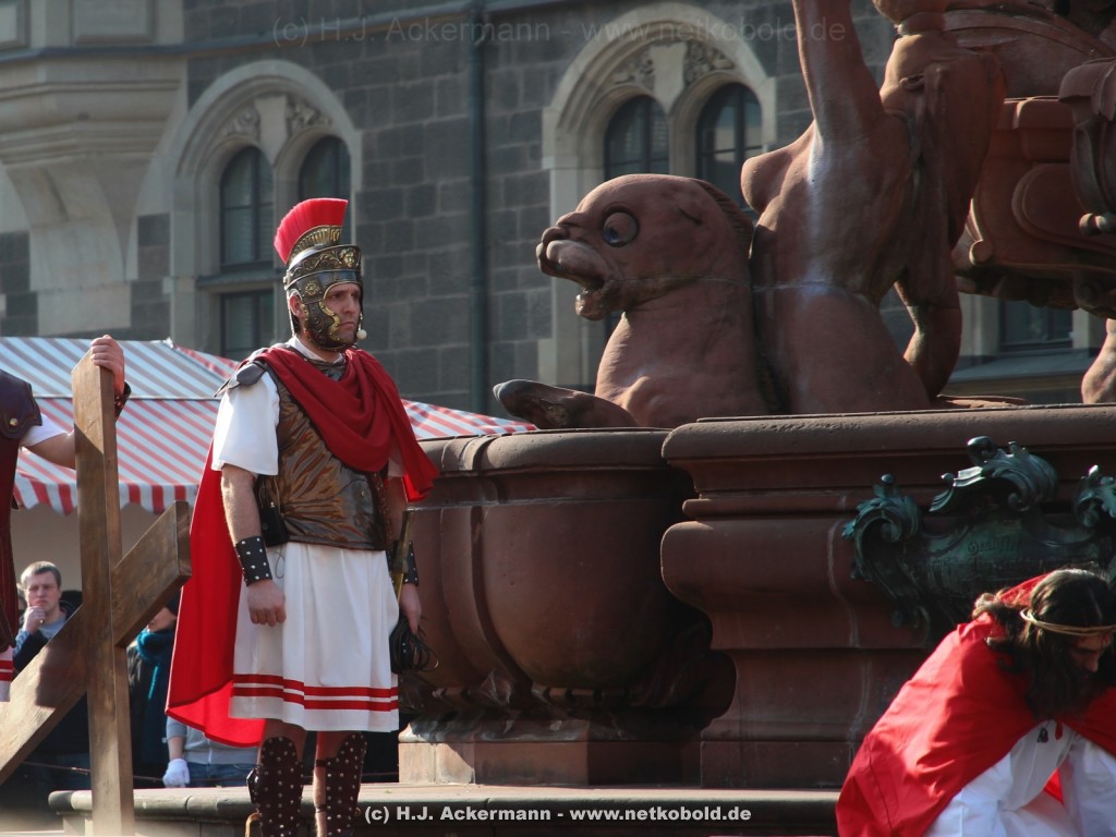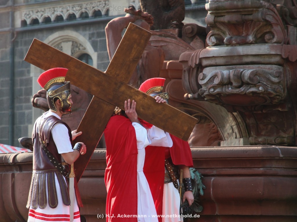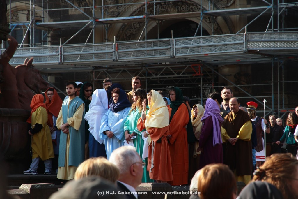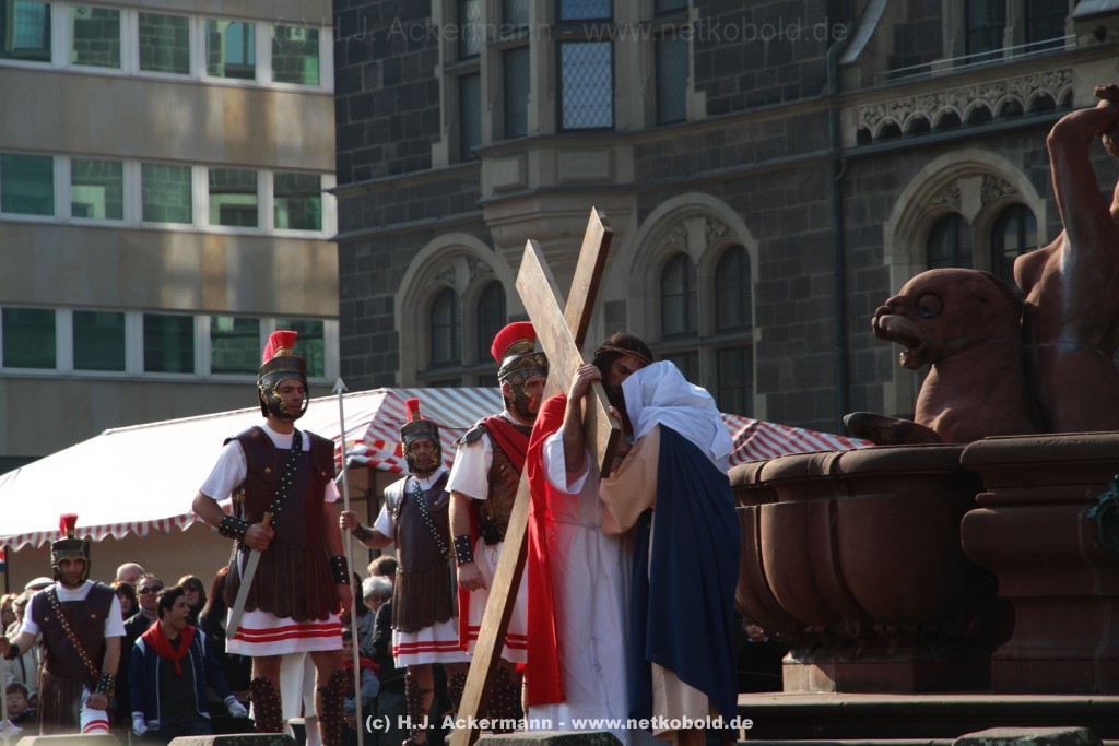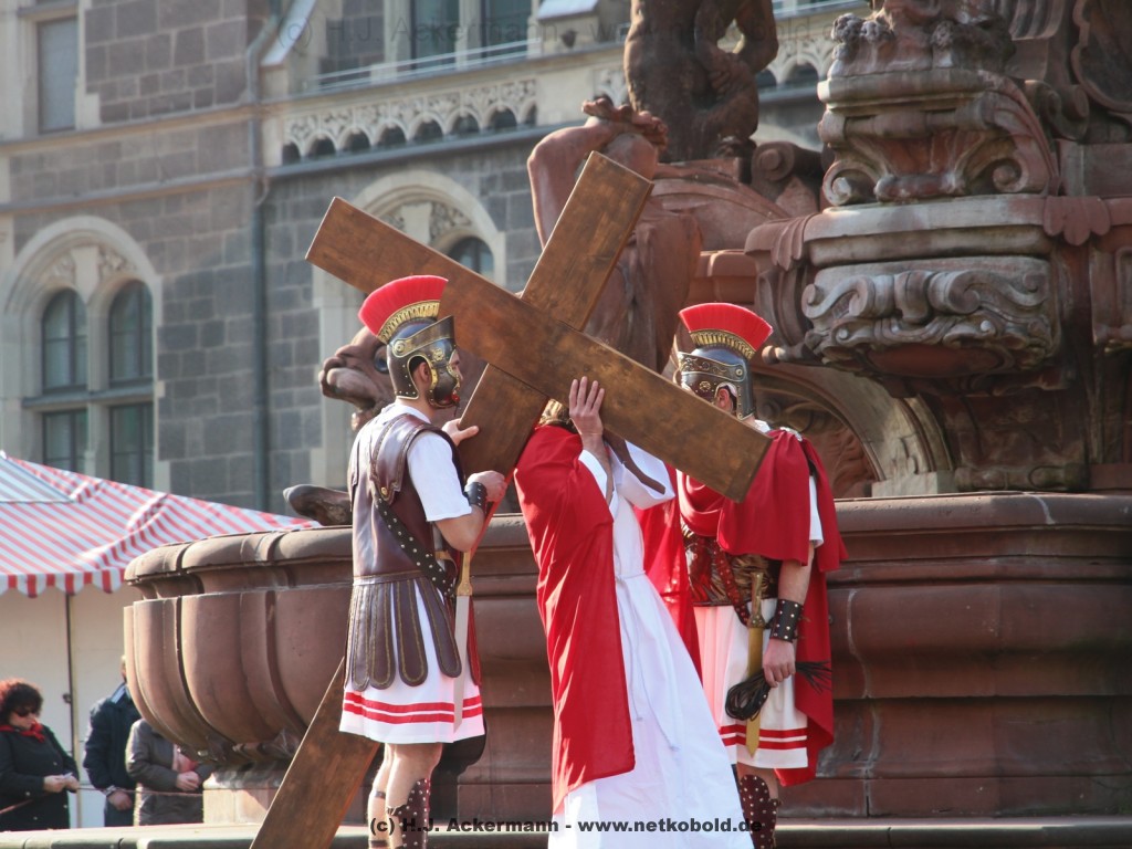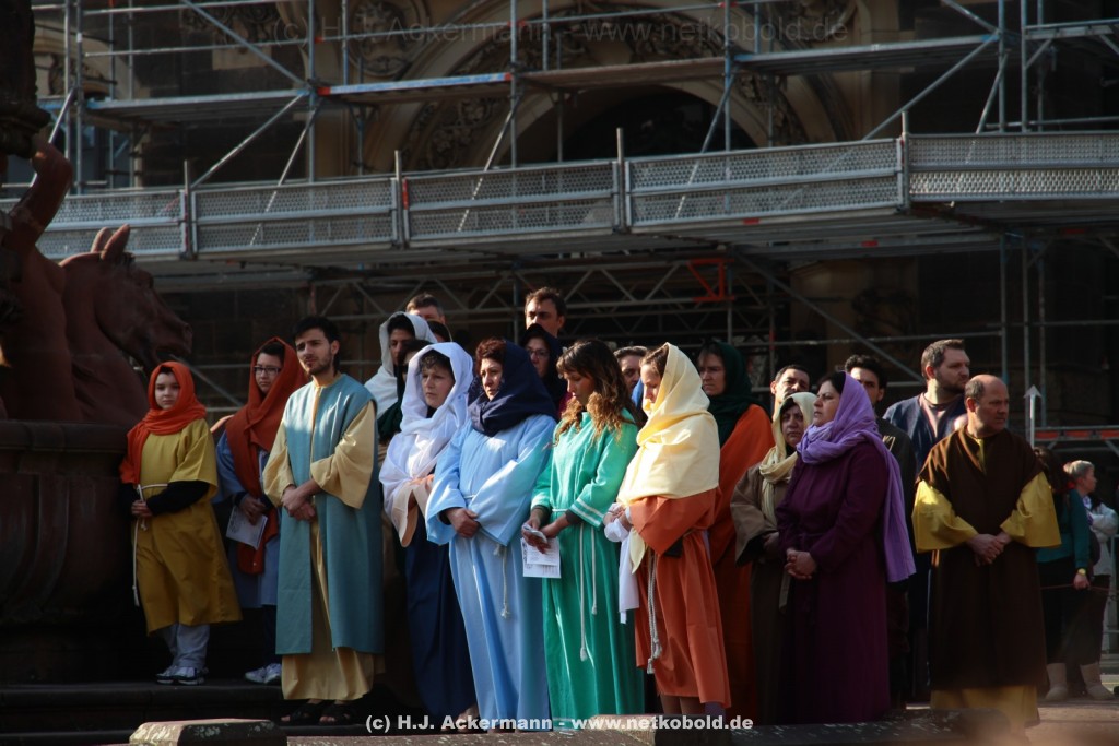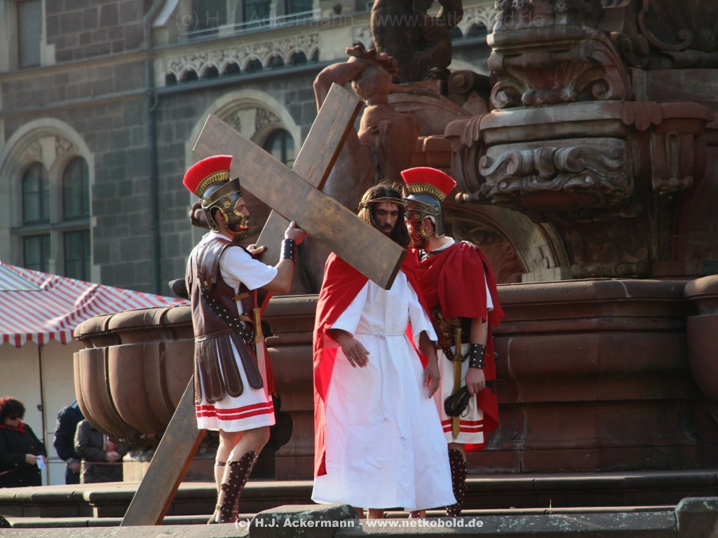 Am Neumarkt, direkt auf dem Brunnen spielt die nächste Scene. Hier trifft Jesus auf einige fromme Frauen. Darunter Veronika, die ihm ein Schweißtuch reicht und seine Mutter.