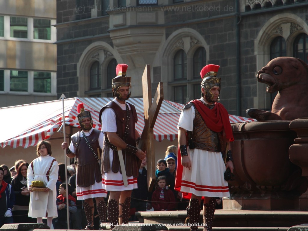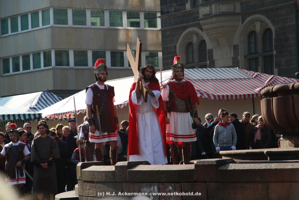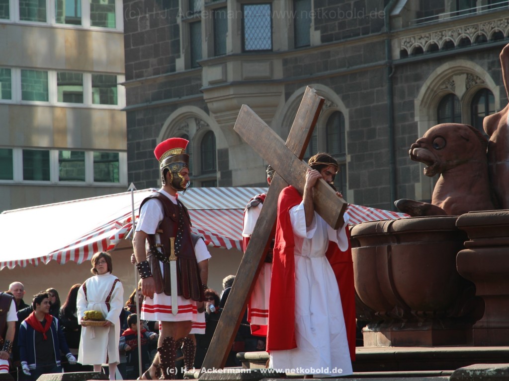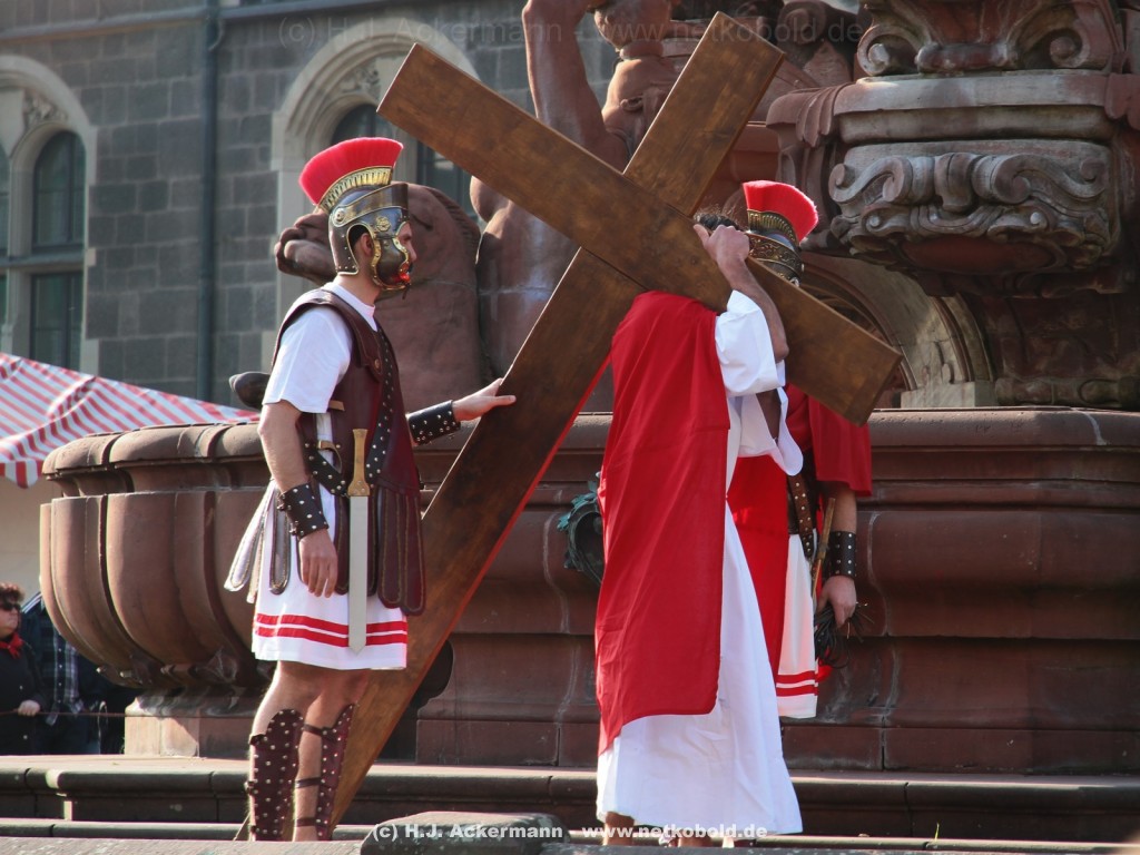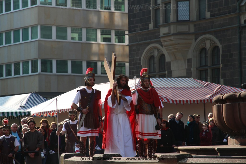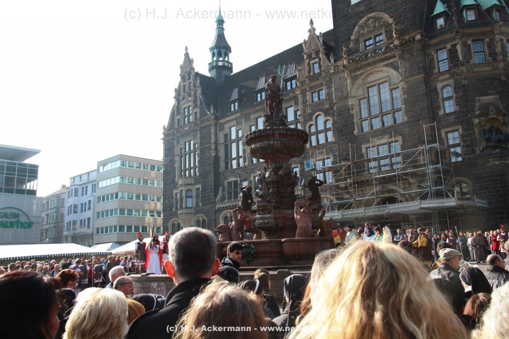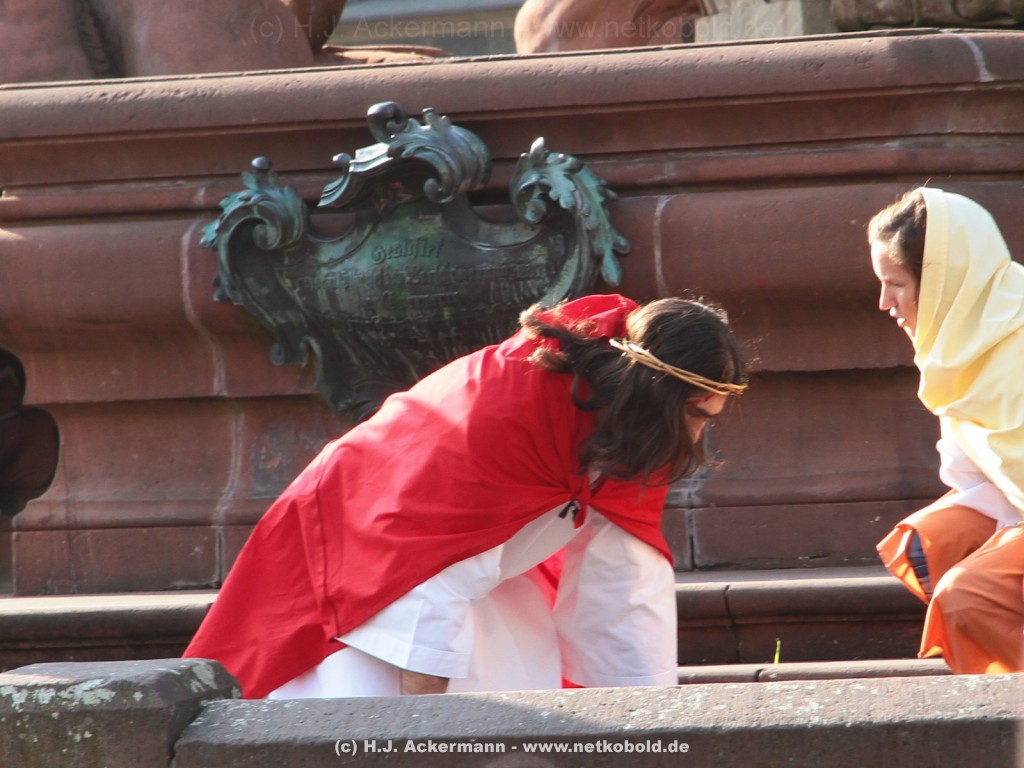 Am Neumarkt, direkt auf dem Brunnen spielt die nächste Scene. Hier trifft Jesus auf einige fromme Frauen. Darunter Veronika, die ihm ein Schweißtuch reicht und seine Mutter.