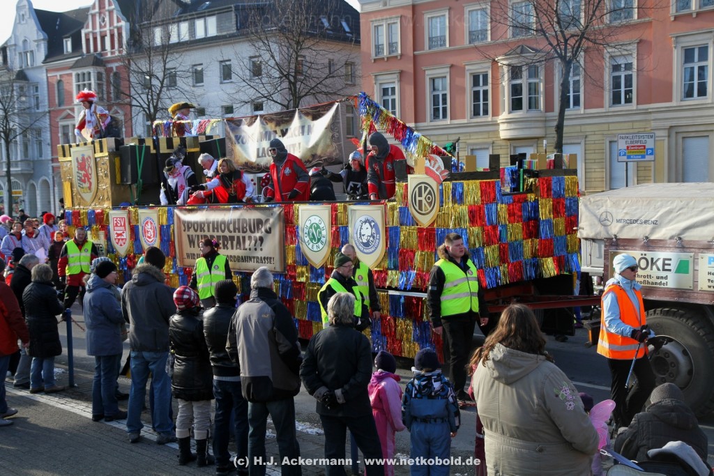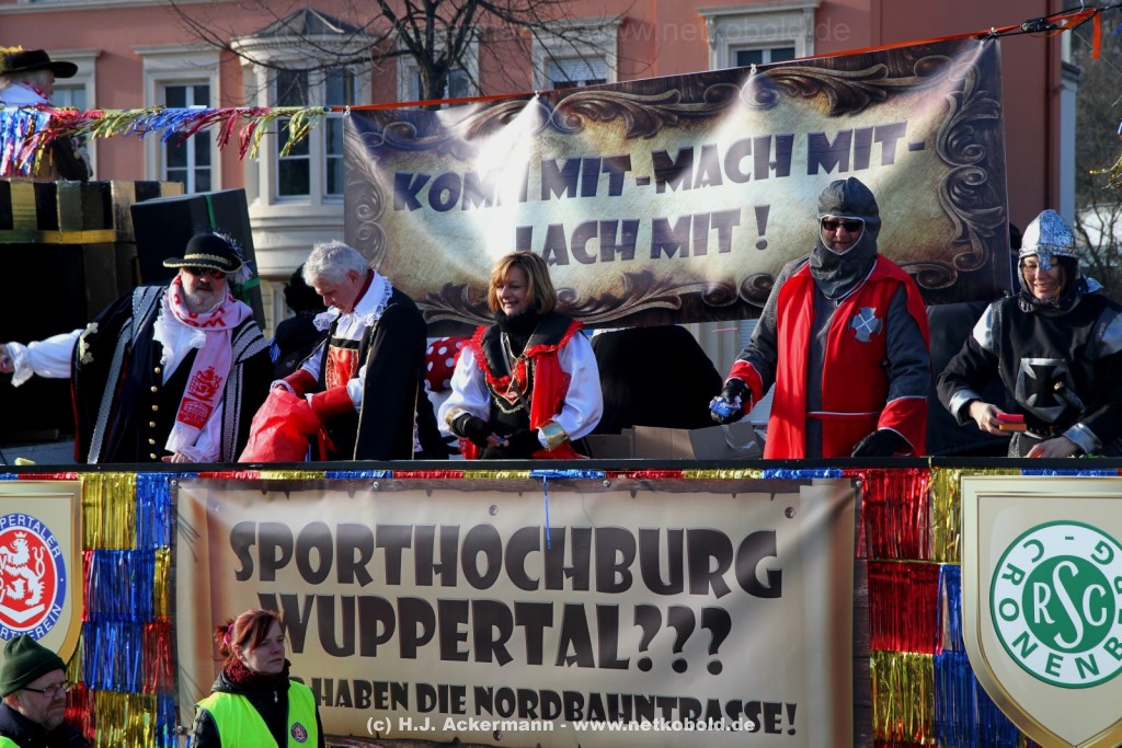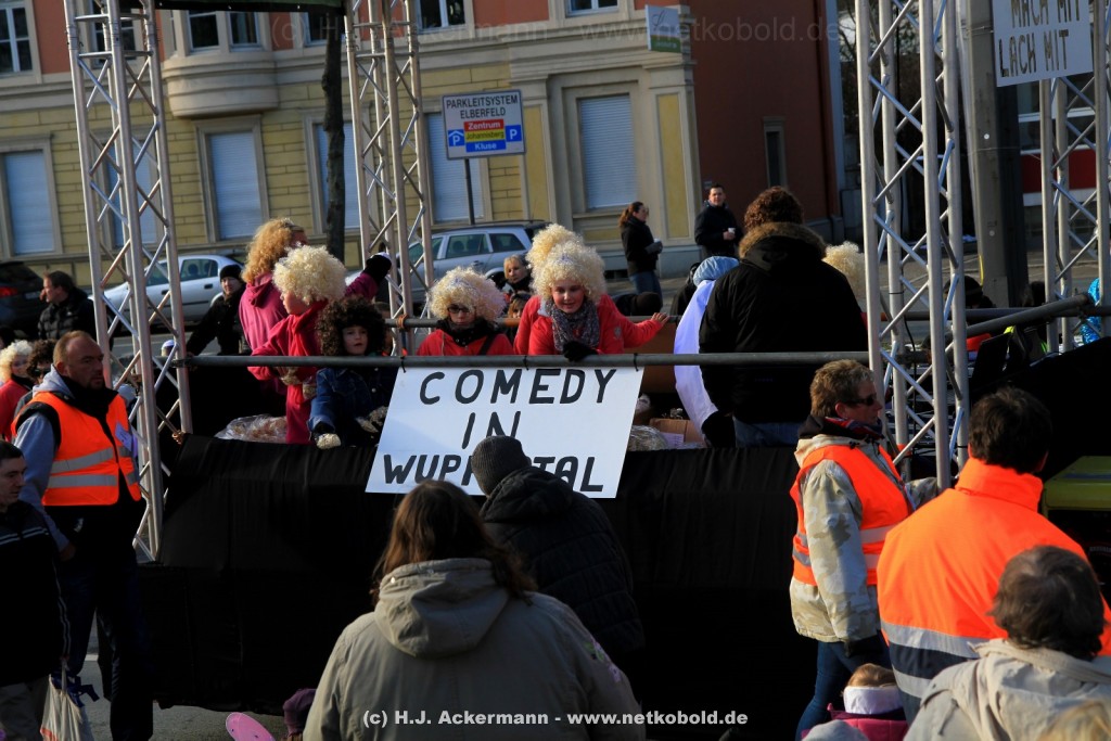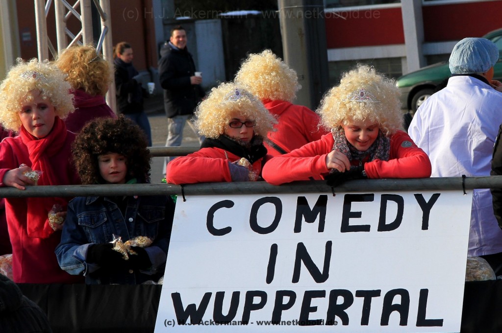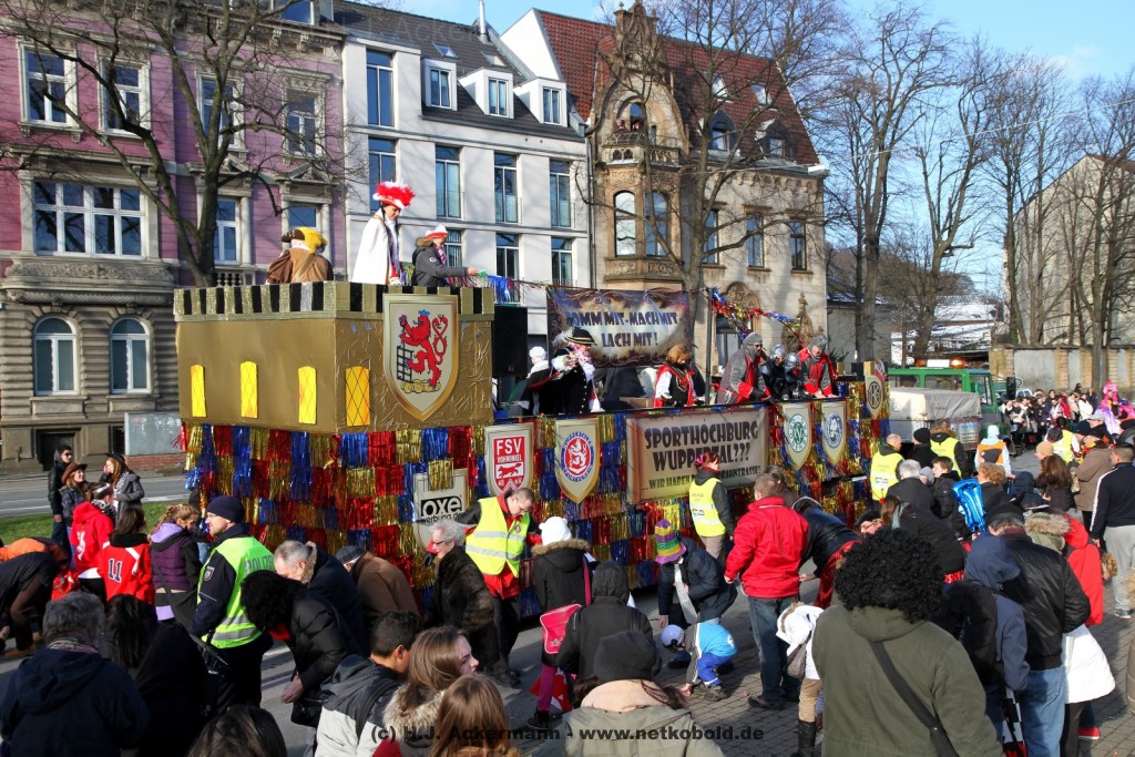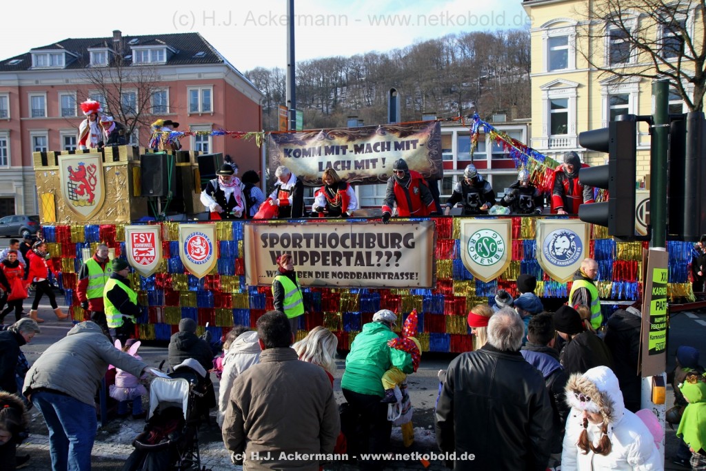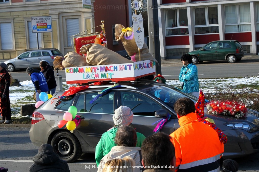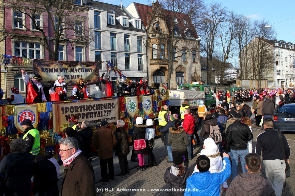 Der Karnevalszug in Wuppertal zog dieses Jahr von Elberfeld nach Oberbarmen. Ab 12:30 Uhr wurde der Zug am Hofkamp aufgestellt und zog dann über die Haspeler Brücke auf die Friedrich-Engels-Alle. Von dort ging es dann bis nach Oberbarmen. Das Motto des Zuges war: „Komm mit – Mach mit – Lach mit“. Ca. 80 Tausend Besucher säumten den Straßenrand vom Hofkamp bis zum Wupperfeld. Unterwegs waren dieses Jahr 30 Wagen und ca. neun närrische Fußgruppen.