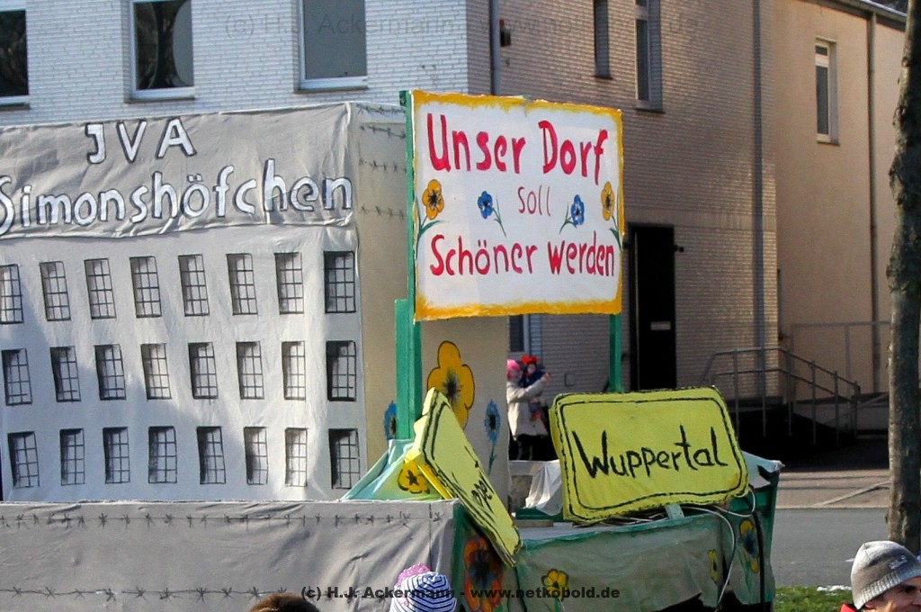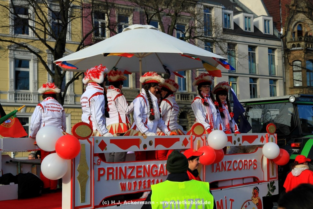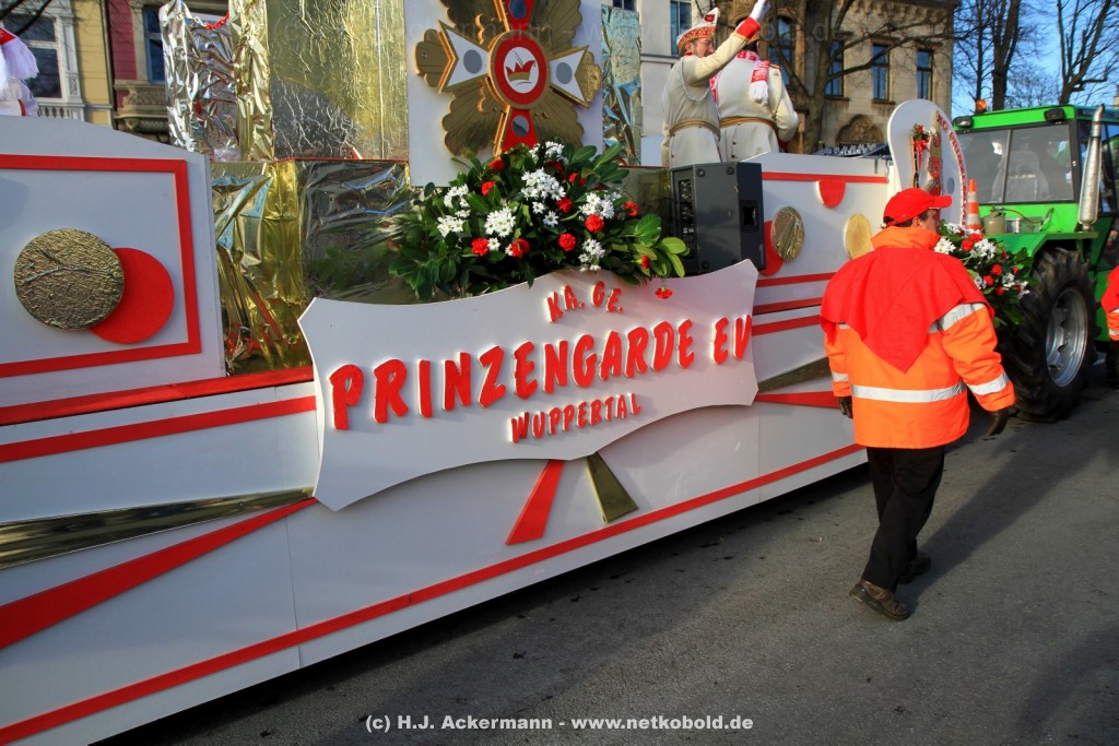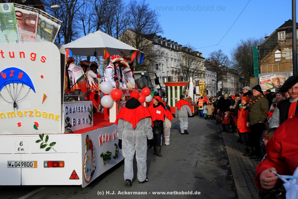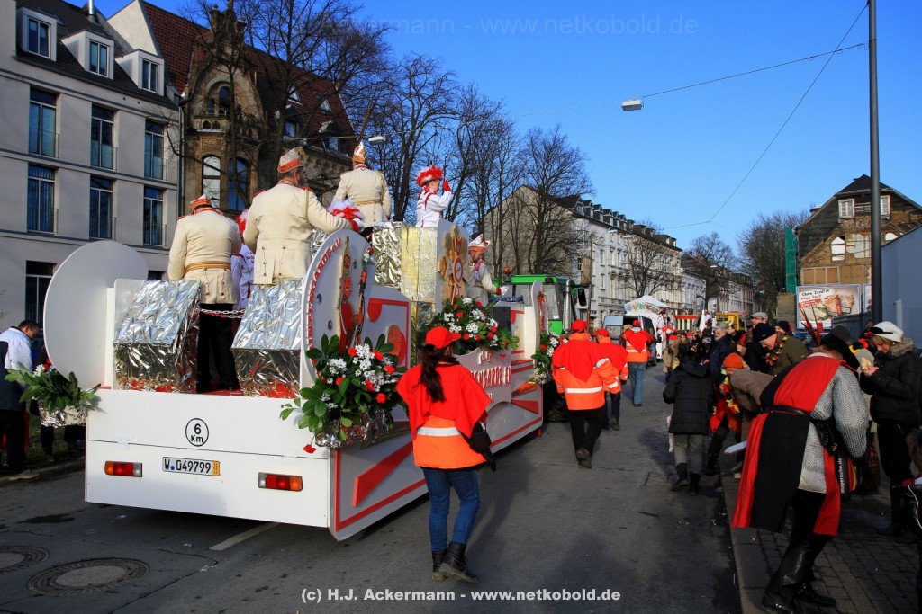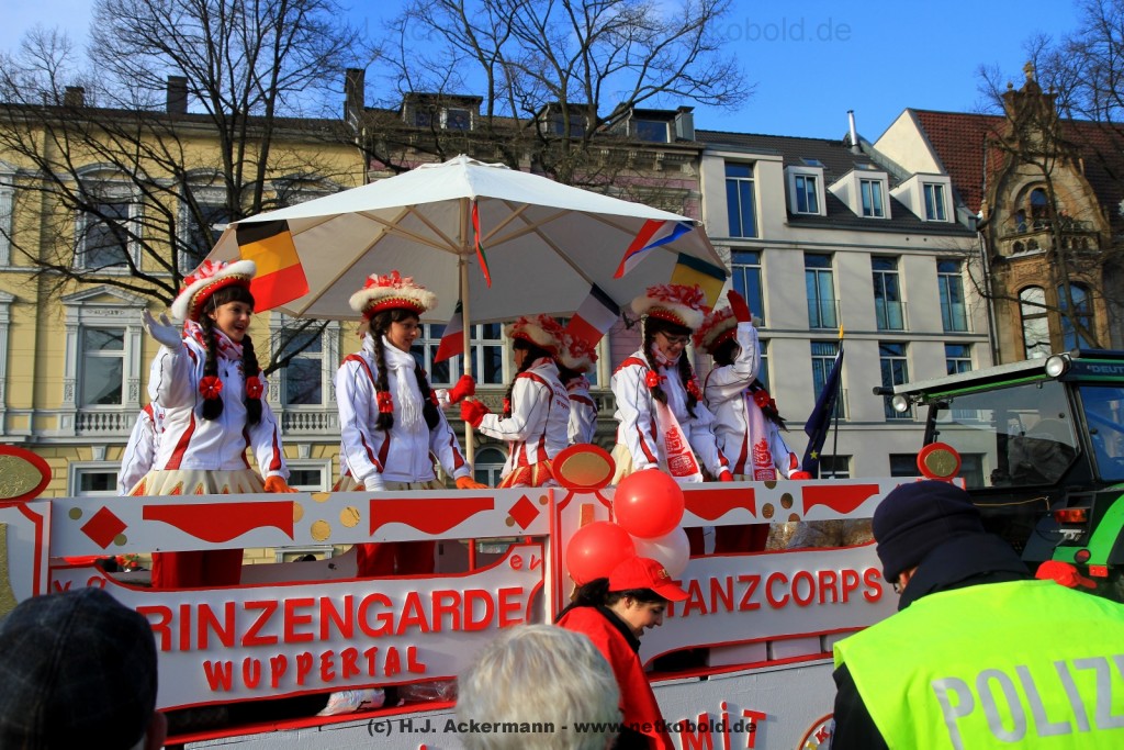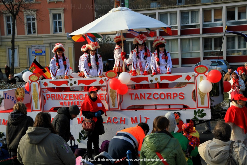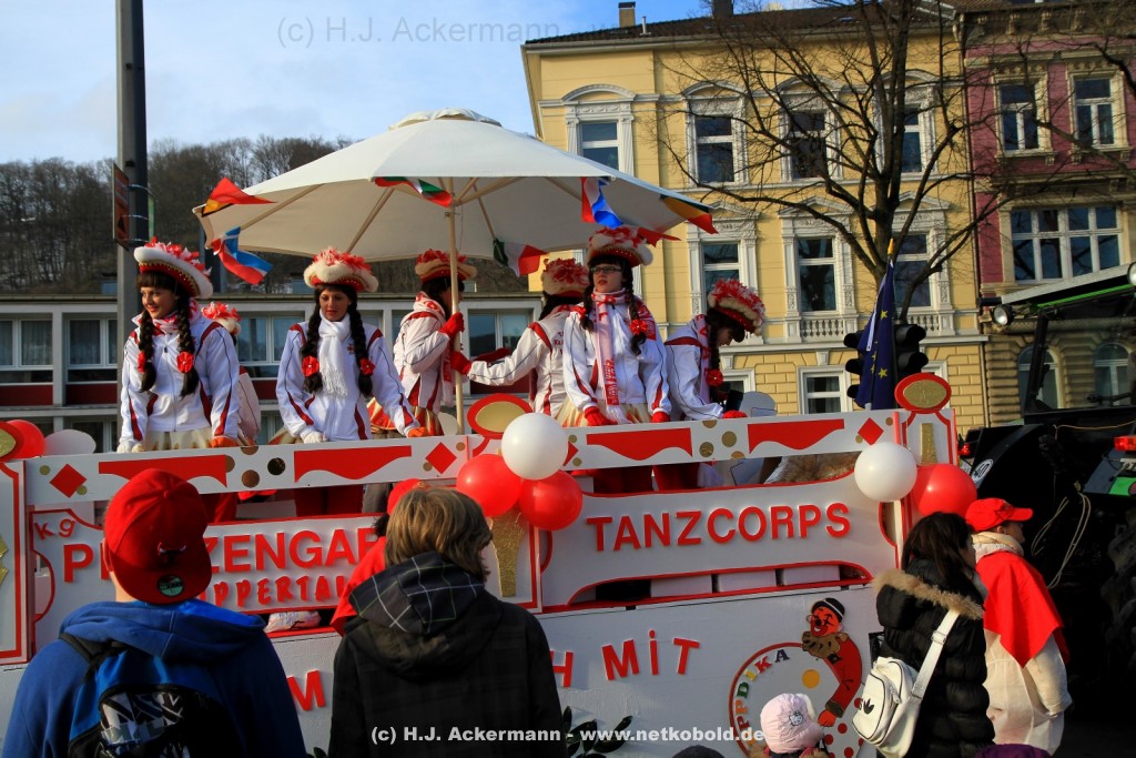Der Karnevalszug in Wuppertal zog dieses Jahr von Elberfeld nach Oberbarmen. Ab 12:30 Uhr wurde der Zug am Hofkamp aufgestellt und zog dann über die Haspeler Brücke auf die Friedrich-Engels-Alle. Von dort ging es dann bis nach Oberbarmen. Das Motto des Zuges war: „Komm mit – Mach mit – Lach mit“. Ca. 80 Tausend Besucher säumten den Straßenrand vom Hofkamp bis zum Wupperfeld. Unterwegs waren dieses Jahr 30 Wagen und ca. neun närrische Fußgruppen.