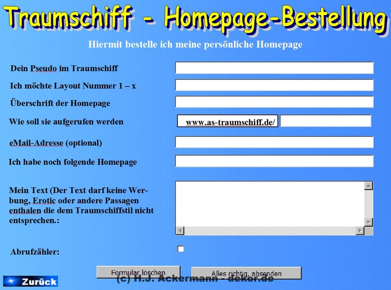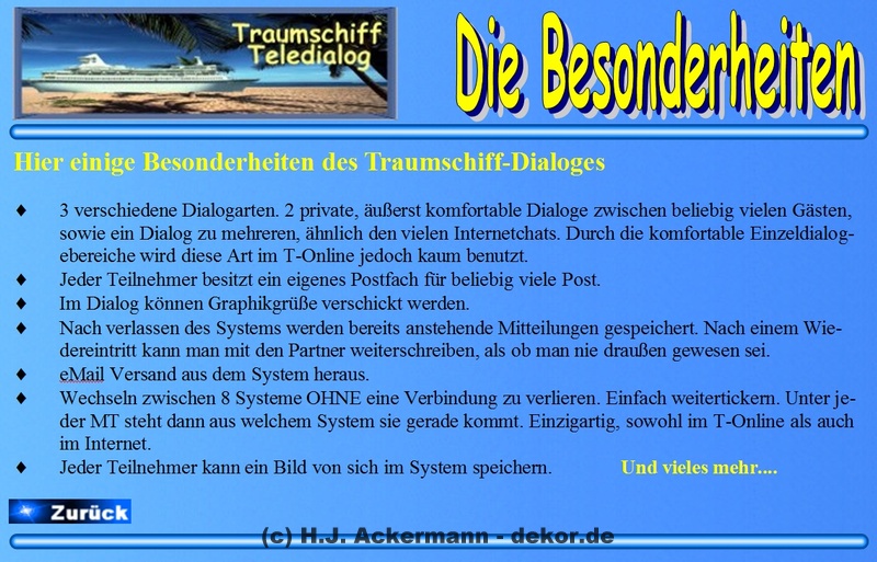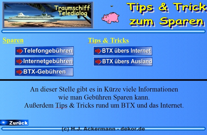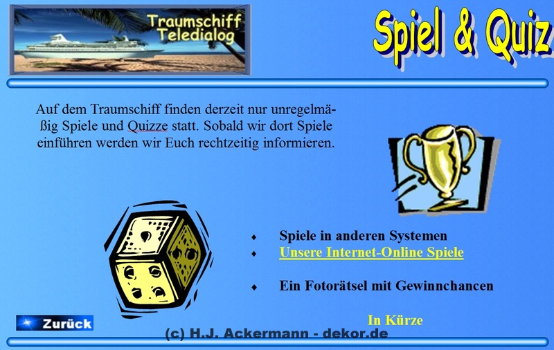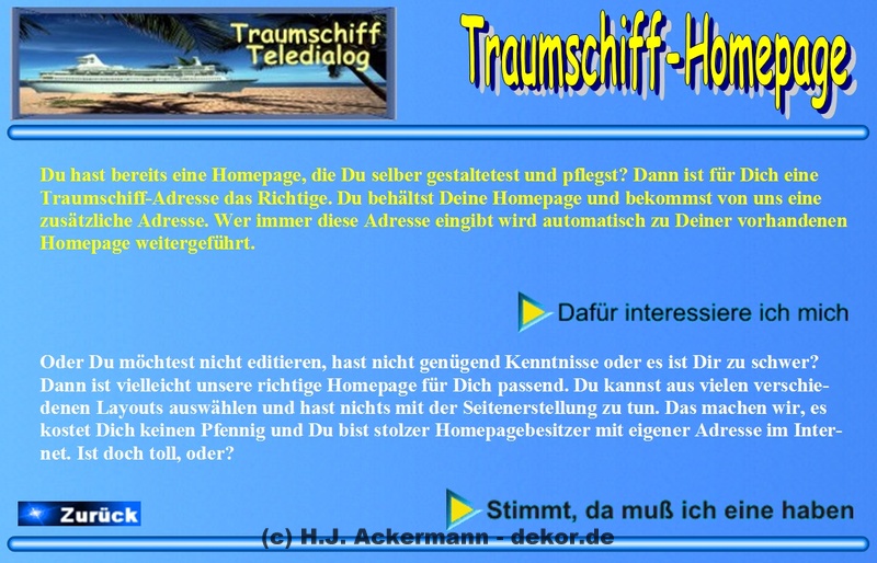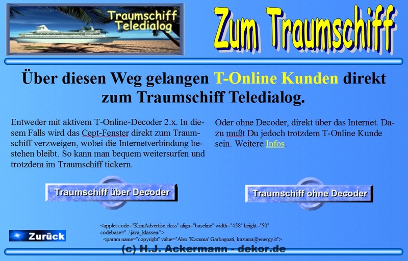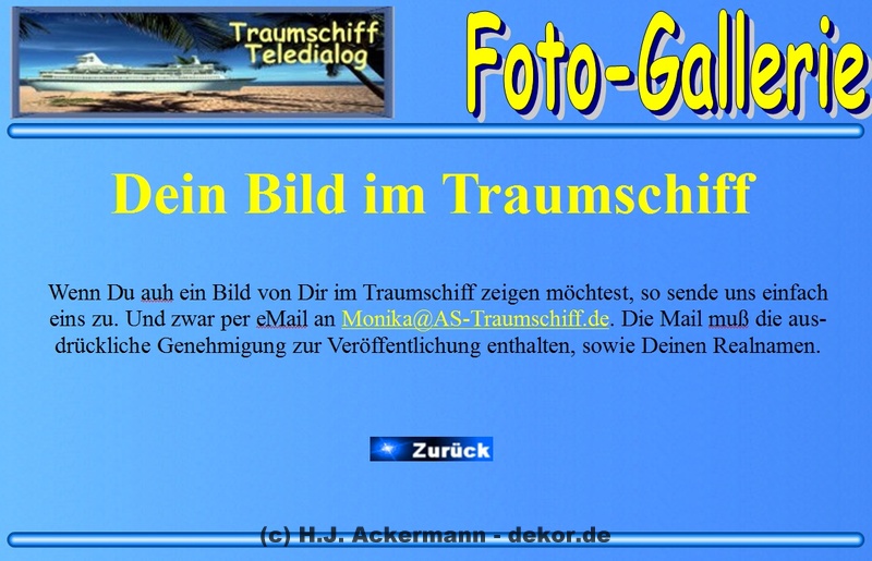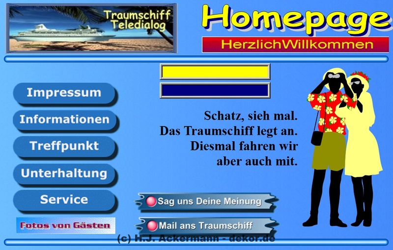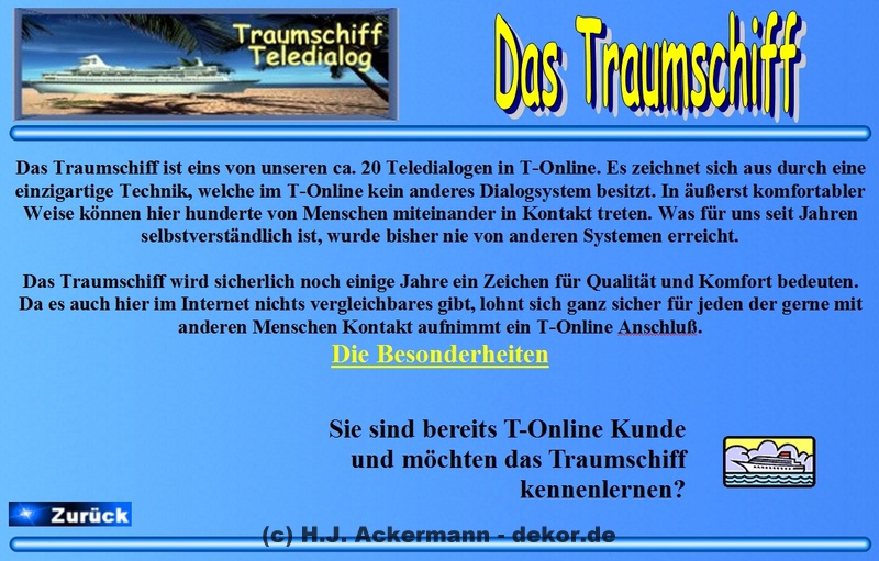 Das Traumschiff hatte bereits 1998 eine Homepage im BTX. Diese war allerdings damals noch sehr einfach gehalten und diente den Gäste als Informationsseite. Da sich viele Gäste damals wünschten größere Fotos von sich zeigen zu könne, wurden diese dann ebenfalls auf der Homepage im Internet gezeigt. Aufrufen konnte man sie jedoch direkt im BTX-Traumschiff. Da die Homepage nicht mehr direkt im Internet aufrufbar ist, finden Sie hier als Galerie einige der Seite damaligen Seiten.